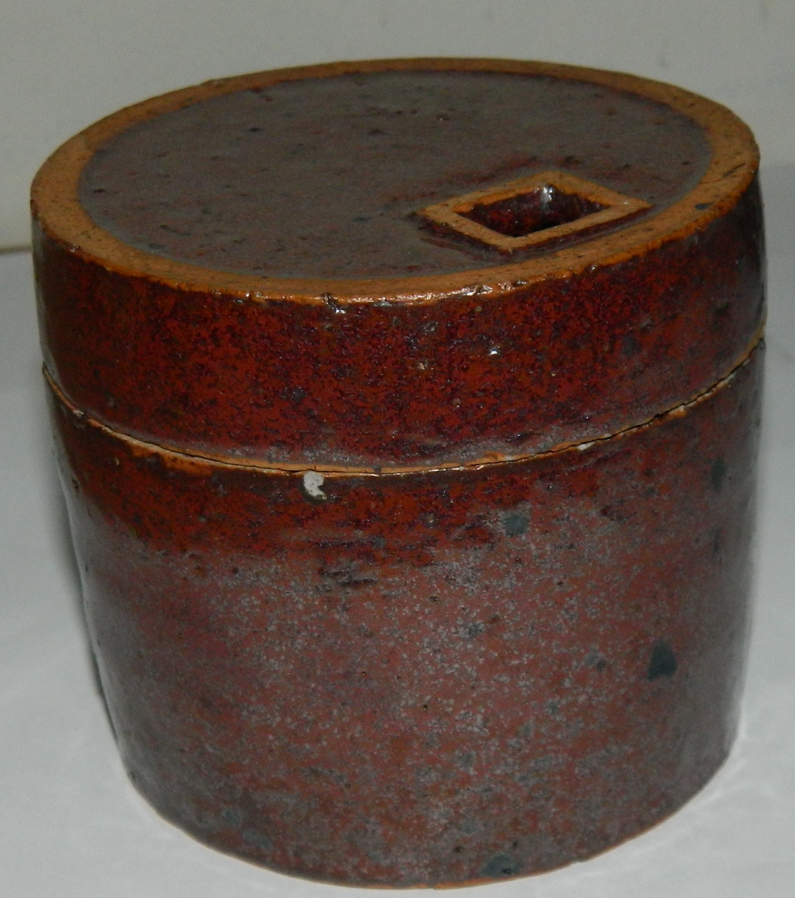 Brun glaseret lågskål i keramik af Gunhild Aaberg. Har et enkelt lille overfladeskår (se foto) samt et par minimale småskår indvendigt efter brug. Ellers ingen skader eller reparationer. Signeret af kunstneren på bunden. 8 cm høj og diameter på 9 cm.