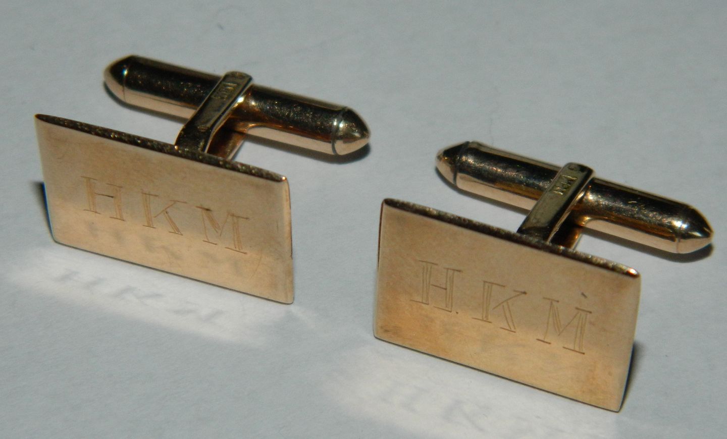 Par manchetknapper i 18K guld. Initialer indgraveret HKM på overfladen. Stemplet 18K. Mål: 1,8 cm x 1,2 cm.