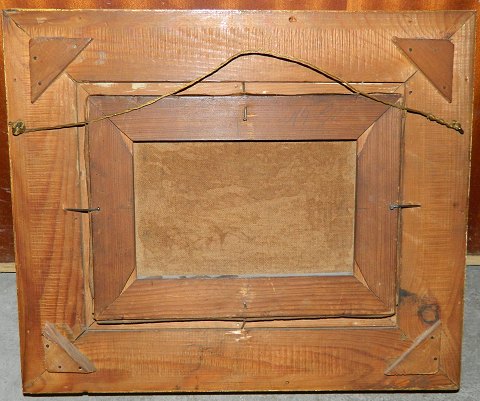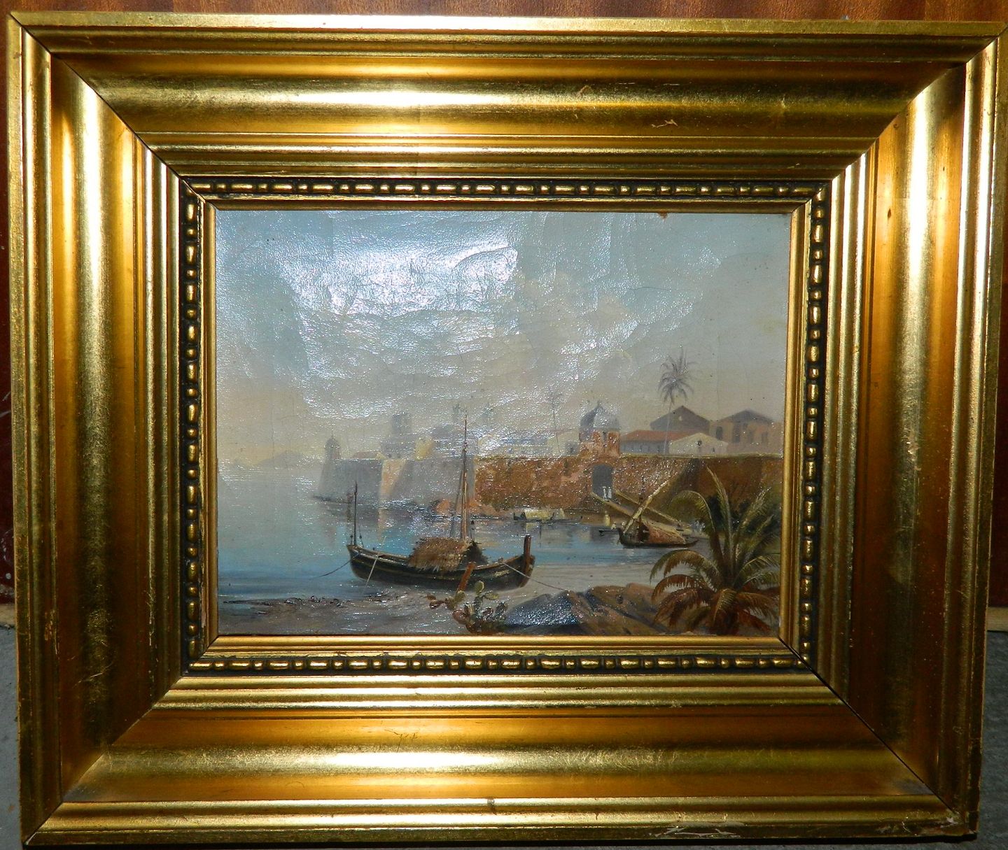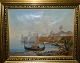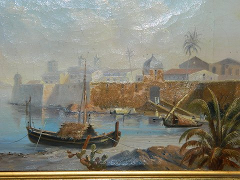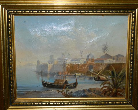 Lille oliemaleri i stærke farver med motiv fra sydlige himmelstrøg. Malet i første del af 20. århundrede. Mål incl. ramme 30 cm x 36 cm (18 cm x 24 cm).
