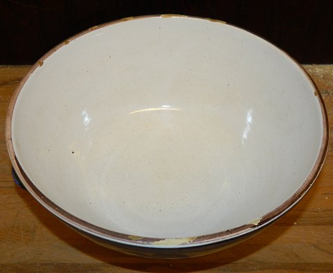 Stor skål af Odette Syberg (1907-1993) fra ca. 1950. Dekoreret med elefant på den ene side og en tiger på den anden side. Skålen har flere glasurafslag. Fremstår uden skader eller reparationer. Fabriksmærket med det velkendte Syberg logo samt kunstnersignatur O.S. på bunden. Skålen er 15½ cm høj og 30 cm i åbningsdiameter.