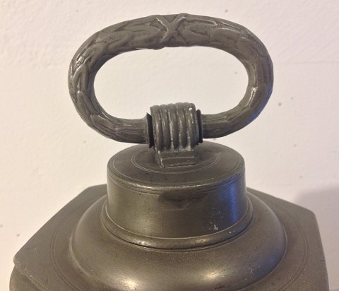 Sekskantet beholder i tin med låg. Dekoreret med oval punslet ramme med ejerens initialer heri. Fremstår i god stand med almindeligt brugsslid. Fremstillet i første halvdel af 19. århundrede. Ingen skader eller reparationer. Højde incl. opretstående hank: 30½ cm.