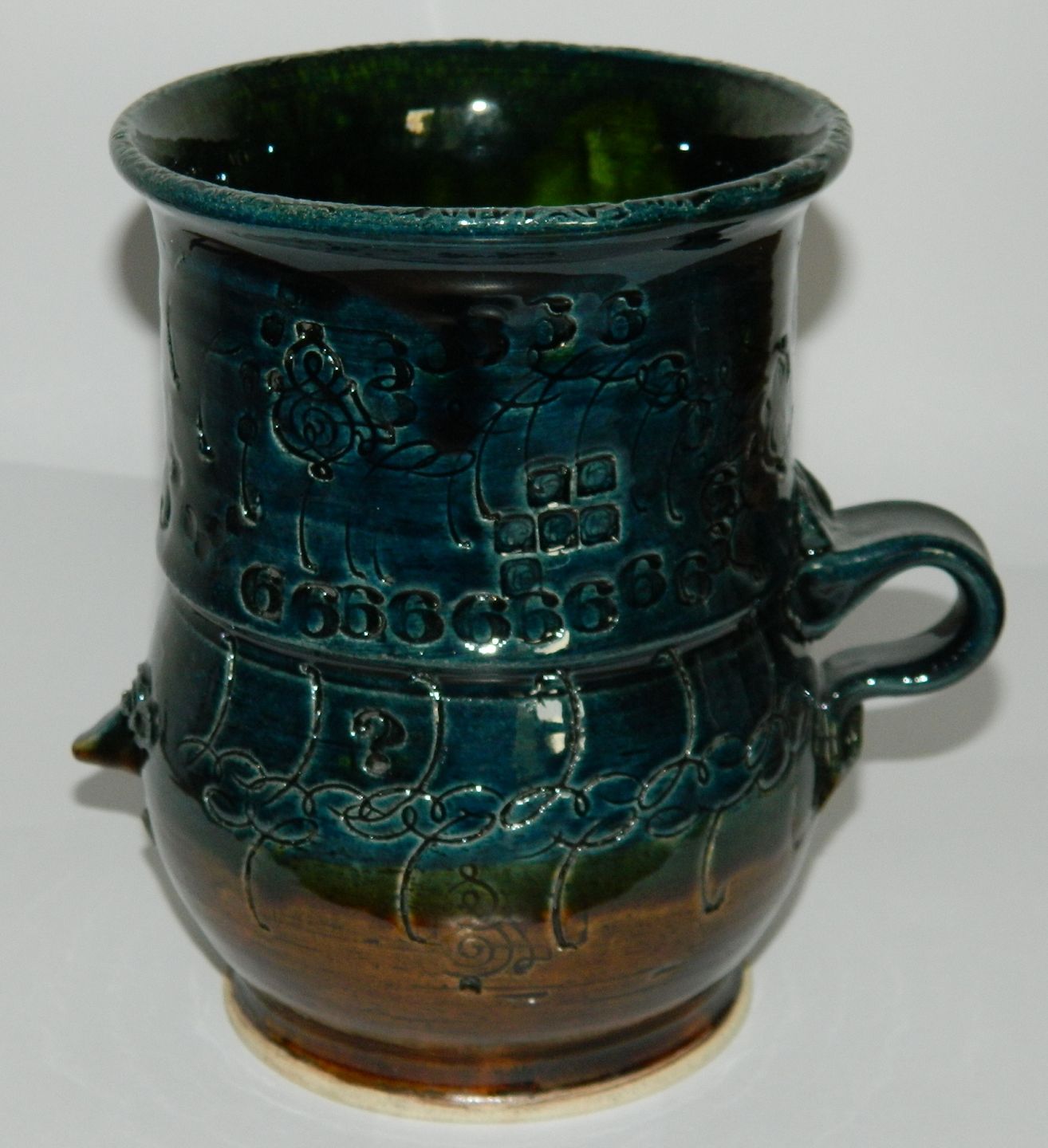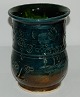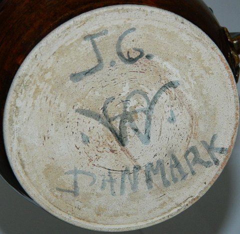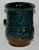 Vase dekoreret med ansigt og hank i keramik fra Bjørn Wiinblad. Indstemplet dekorationer rundt om vasen bl.a. 6-taller. Fremstår i god stand. Kunstnersignatur på bunden J. G. 16½ cm høj.