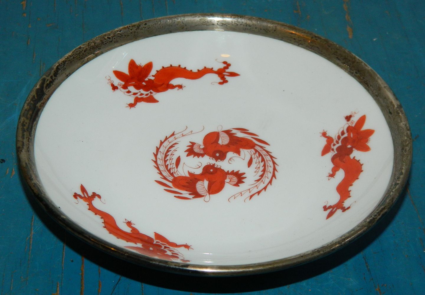 Smaller plate or dish from Meissen, Germany, made about 1900 Decorated with dragons in red! Metal Decoration on the edge. Not silver stamped! Metal Edge is possibly due to repair. The dish is factory mark on the bottom. 3 cm high and 15 ½ cm in diameter.