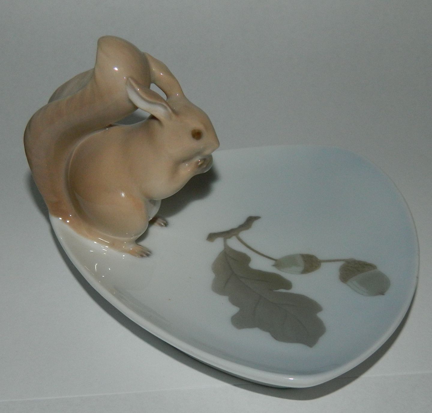 Skønvirkeperioden: Mindre fad med dekoration af nød. For enden et egern. Modelnummer 1323/981 Fremstillet mellem 1900-1923 for Royal Copenhagen. 1. sortering. Fremstår i god stand uden skader eller reparationer. Fabriksmærket på bunden. 7½ cm høj.