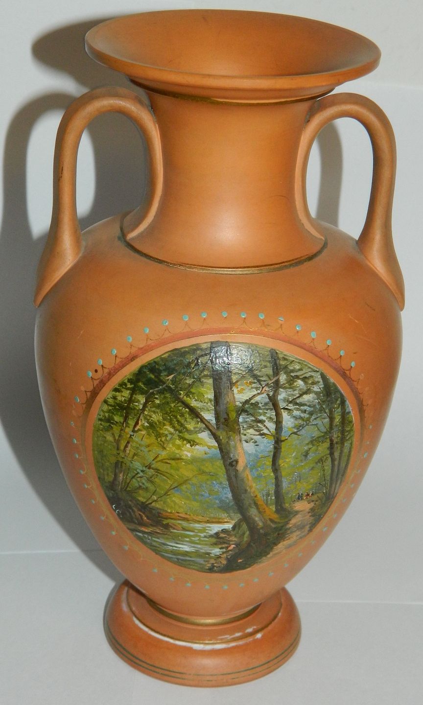 Vase i teraccotta fra ubekendt bornholmsk keramikfabrik med bemalet motiv fra Døndalen. Fremstillet omkring 1900. Fremstår i perfekt stand uden skader eller reparationer. Ingen fabriksmærker, stempler eller nummeringer. Intet der indikerer hvorfra vasen er lavet. Vasen er 21 cm høj.