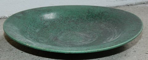 Fad i stentøj fra Arne Bang. Fremstillet omkring 1940. Fremstår i god stand uden skader eller reparationer. På for -og bagside dækket af en grøn spættet glasur. Fabriksmærket på bagsiden med AB samt modelnummer. Mål: 5½ cm høj og 28 cm i diameter.