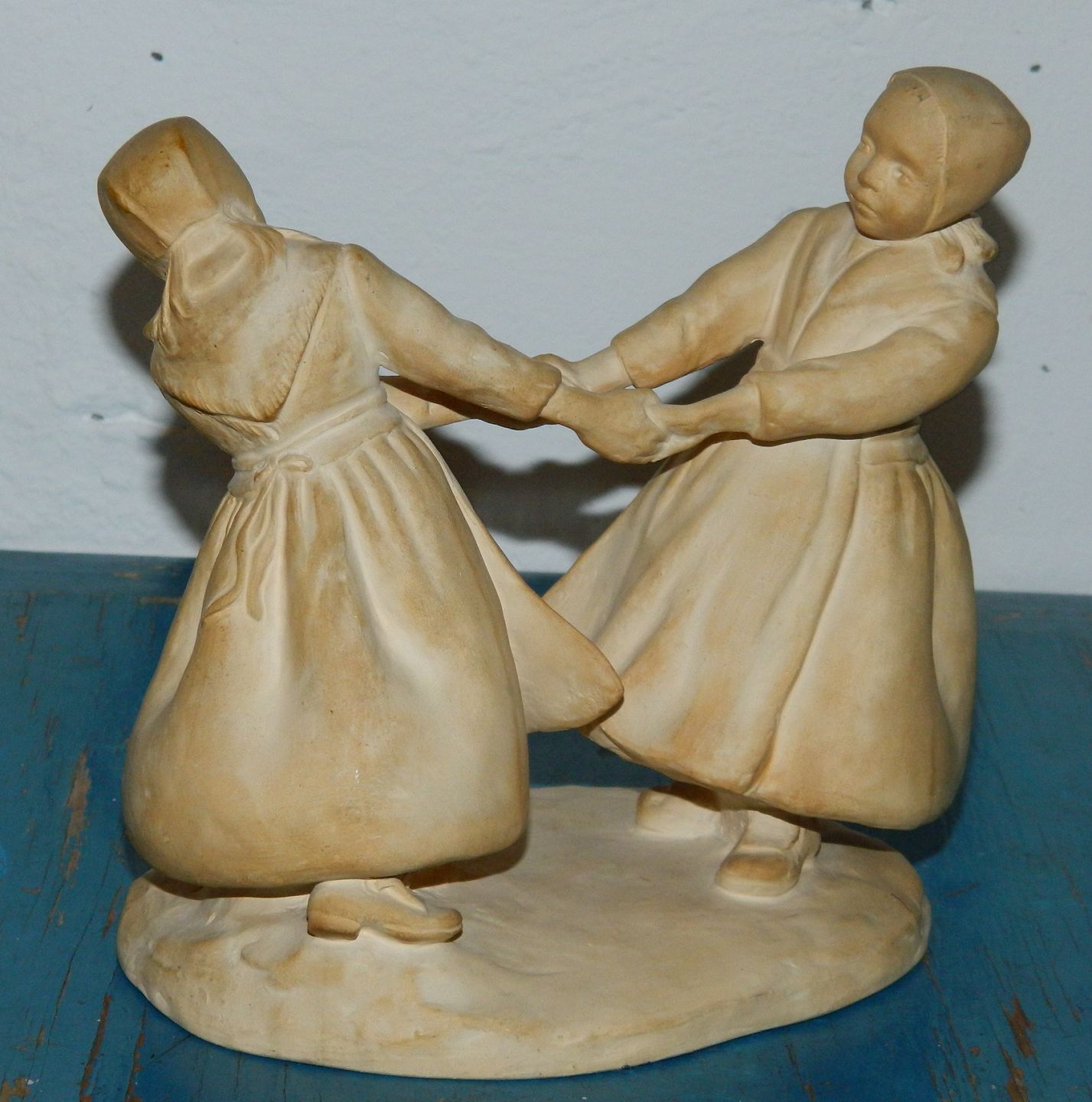 Figur i terracotta af par dansende piger. Fremstillet hos P. Ipsen, Kjøbenhavn, ca. 1900. Fremstår i god stand uden skader eller reparationer. Fabriksmærket på bunden. Mål: 15 cm høj. Basen måler 10 cm x 14 cm.