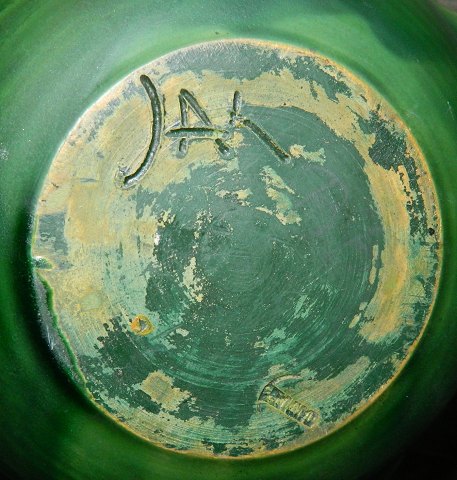Grøn glaseret skål med bølget kant fra Kählerfabrikken fra omkring 1940. Fremstår i god stand uden skader eller reparationer med almindeligt brugsslid. På bunden mærket HAK samt DANMARK. Mål: 8½ cm høj og åbningsdiameter på 24 cm.