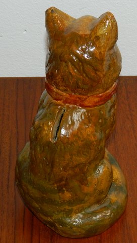 Sparebøsse i keramik i form af siddende kat. Fremstår i god stand uden skader eller reparationer. Fremstillet omkring 1920. 17 cm høj.