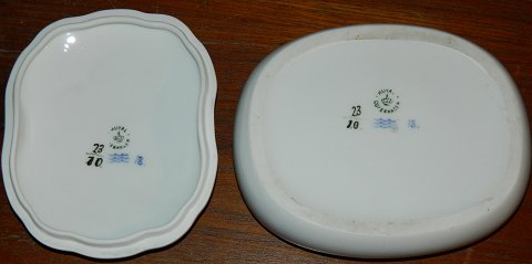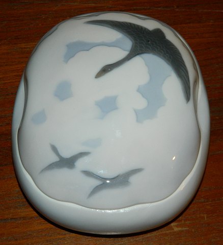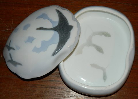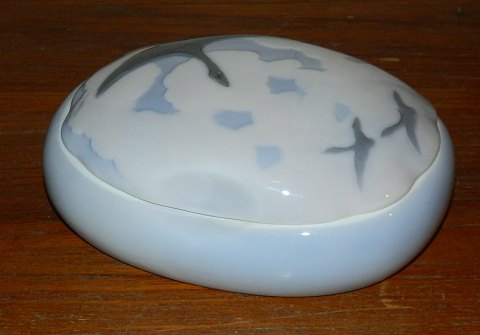 Skål med låg i porcelæn fra Royal Copenhagen. Fremstillet mellem 1900-1923. Organisk i formen. Dekoreret med tre svaner på låget. Dekoreret i bunden af skålen. Fremstår i perfekt stand. Ingen skader eller reparationer. 1. sortering. Fabriksmærket på bunden. Modelnummer 23/10. Mål: 5½ cm høj, 17 cm lang og 13½ cm bred.