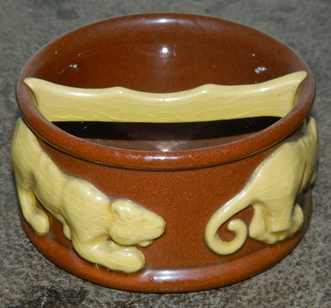 Mindre skål (askebæger)fra Michael Andersen& Søn for C. V. Kjær med dekoration af tiger i relief rundt om skålen. Fremstår i god stand uden skader eller reparationer. Fabriksmærke på bunden. Mål: H. 5 cm Ø. 8½ cm