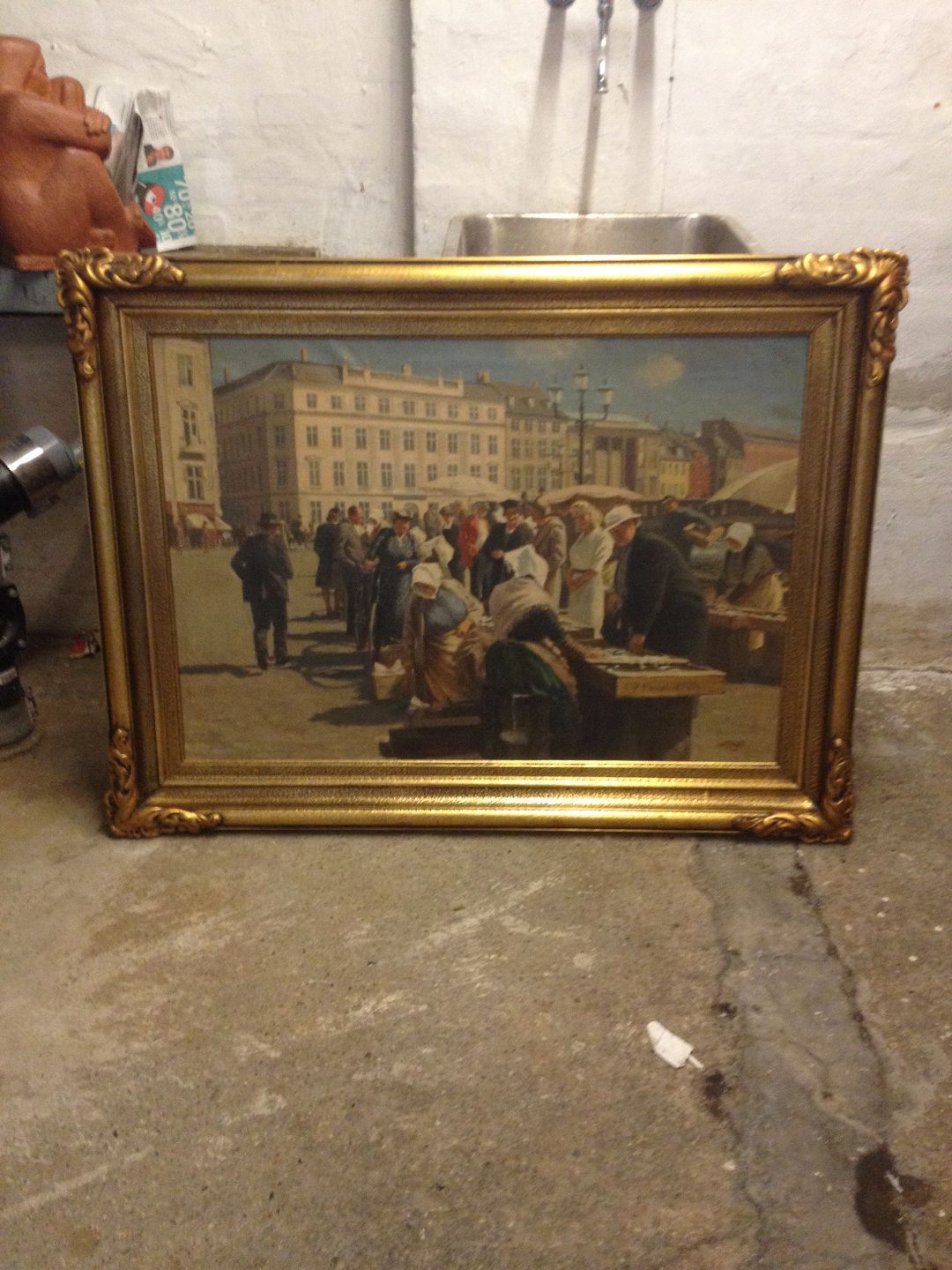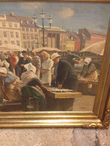 Maleri på lærred med motiv fra Højbro Plads. Malet af Søren Bjulf (1890-1958). På maleriet ses fiskekoner, postbud, smuk ung kvinde mænd og fruer. I smuk ramme i guldbelagt træ. I god stand. Mål: 94 cm x 122 cm