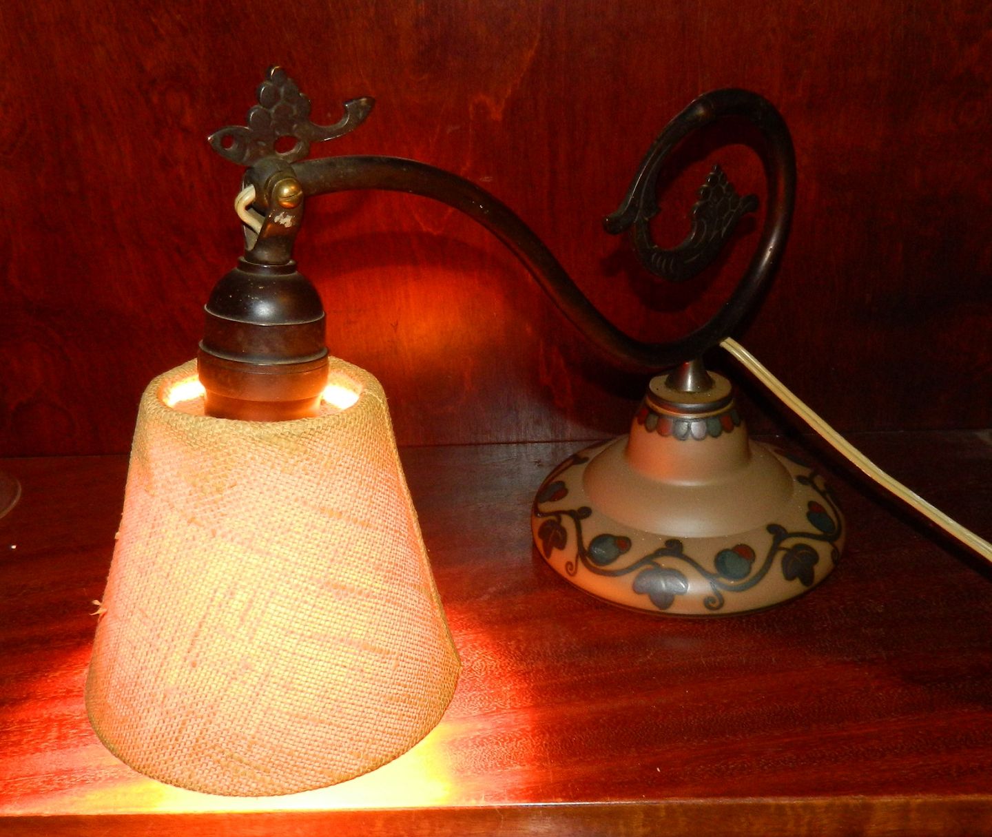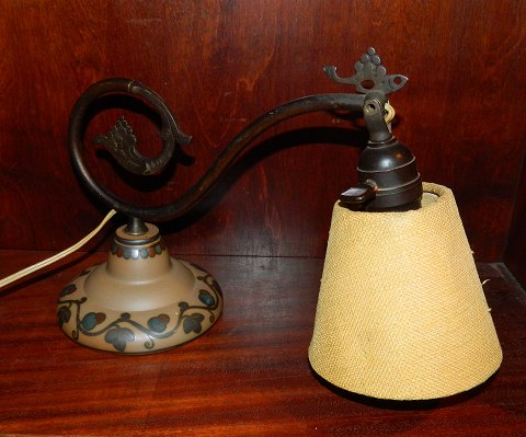 Klaverlampe med fod i keramik fra L. Hjorth. Fremstillet ca. 1930. Som det ses på billedet fungerer lampen. Foden fremstår i perfekt stand. Der ses ingen fabriksmærke, men der er ingen tvivl for kendere om hvor foden er fremstillet. Lampen er 24½ cm høj og 34 cm lang.