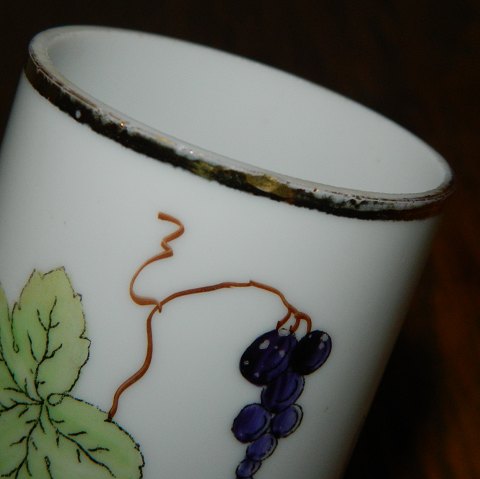 Cylinderisk vase i opalineglas fra Fyens Glasværk ca. 1910. Dekoreret med vinløv samt druer og "Hilsen fra Lohals" på Langeland. Fremstår med meget lille skår på kanten (se foto). 13½ cm høj.