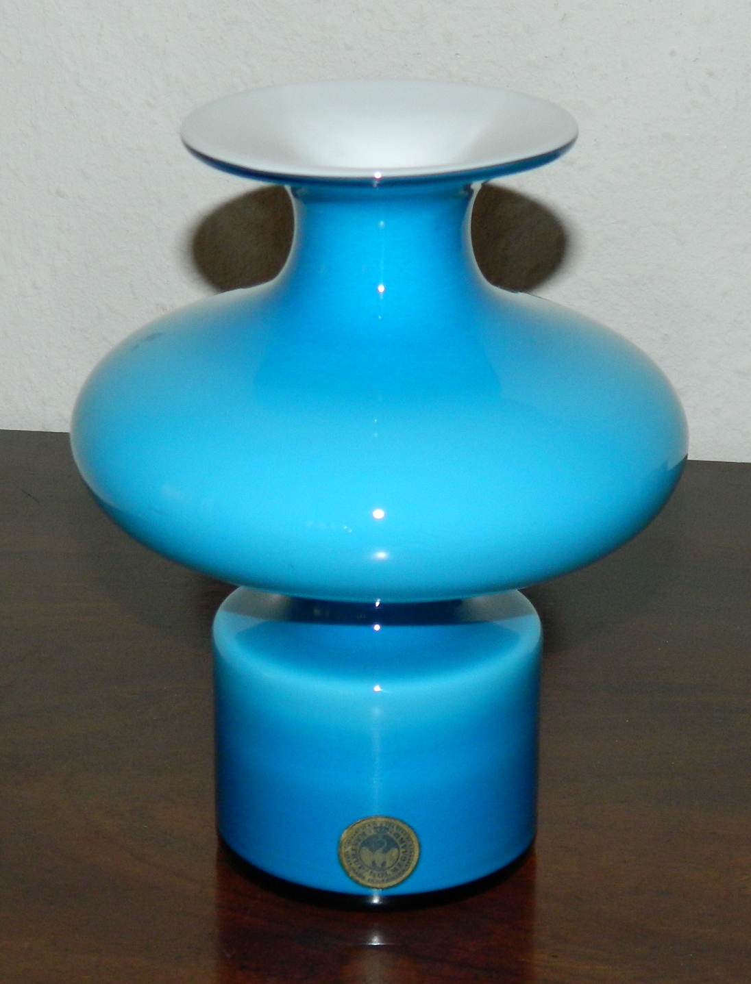 Organisk vase i glas fra Kastrup / Holmegaard Glasværk. Blå udvendig og hvid indvendig. Fremstillet omkring 1970. Original fabrikslabel på siden. 15½ cm høj