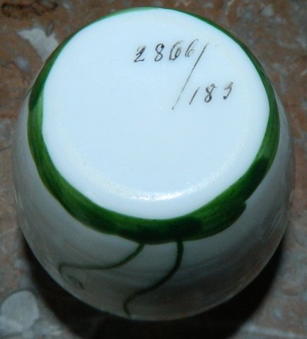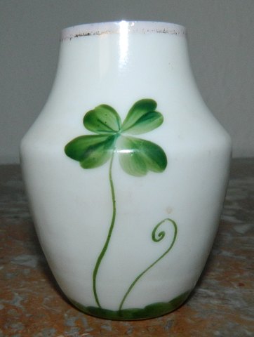 Lille vase i hvid opaline glas fra Fyens Glasværk. Dekoreret med firkløvere. Fremstår i god stand uden skader eller reparationer. 8 cm høj.