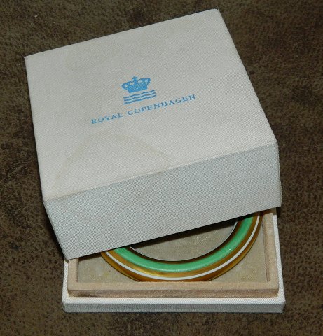 Kgl. armbånd i porcelæn i bemalet porcelæn. Fabrikkens logo - Tre Bølger - påmalet. Original gaveæske fra Royal Copenhagen. Alle dele i perfekt stand. Mål indvendigt: 6½ cm Ydre mål: 9 cm.