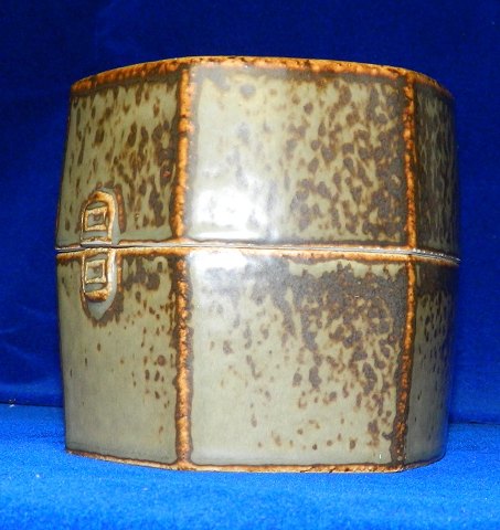 Seks-kantet lågskål i stentøj fra Bing & Grøndahl. Udført af Lisa Engquist. Dækket af en spættet brunlig glasur. Fremstår i perfekt stand uden skader eller reparationer. Fabriksmærket på bunden sammen med kunstnersignatur. 11½ cm høj.