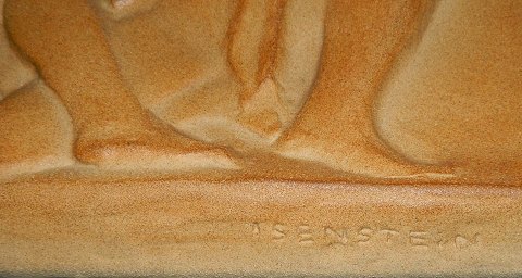 Relief i keramik forestillende ungt nøgent par i siddende stilling. Udført af Harald Isenstein (1898-1980) for den bornholmske keramikfabrik Michael Andersen & Søn. Relieffet har modelnummer 6395. Signatur i nederste højre hjørne.