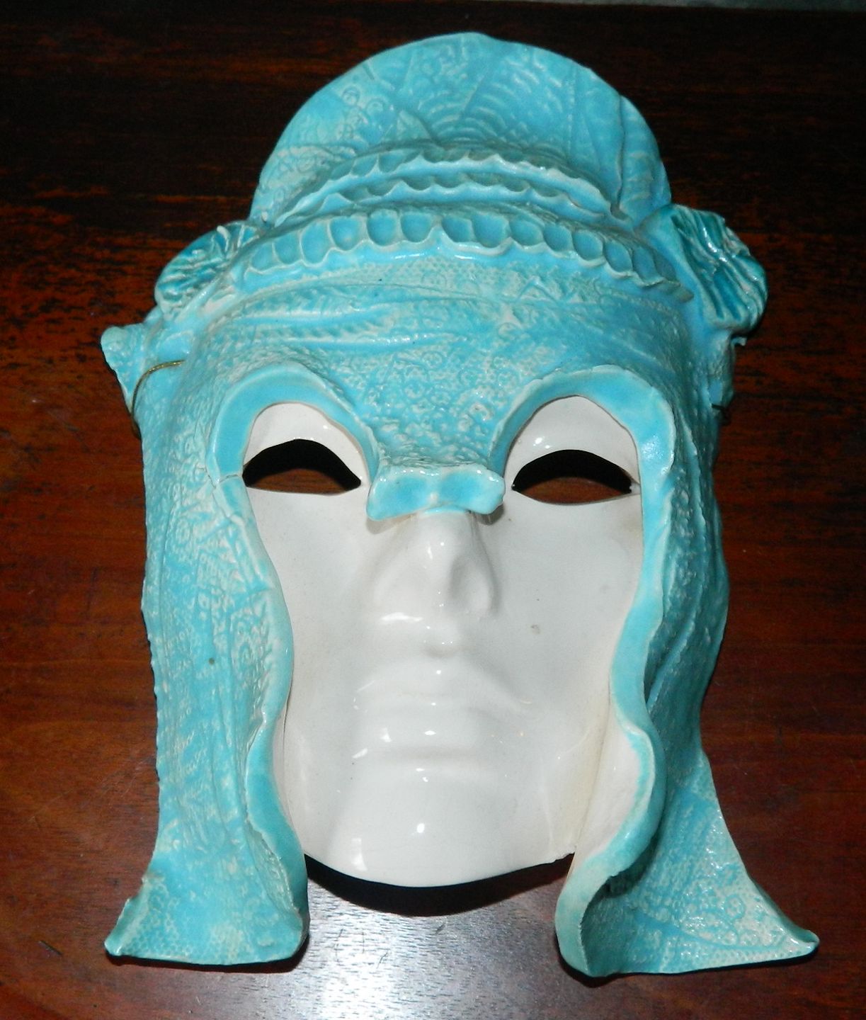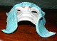 Hvid glaseret maske i keramik med turkis hovedbeklædning. Fremstillet hos Jesper Packness keramik ca. 1990. Fremstår i perfekt stand uden skader eller reparationer. Fabriksmærket på bagsiden. 23 cm høj og 16 cm bred.