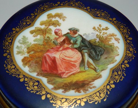 Bemalet lågskål i porcelæn fra ca. 1900. Fremstillet for Meissen, Tyskland, ca. 1900. Dekoreret på to sider med blomster. På låget dekoration med ungt par i stærke farver. 1. sortering. Fabriksmærket på bunden. Mål: 9 cm høj og bunden er 7½ cm i diameter.
