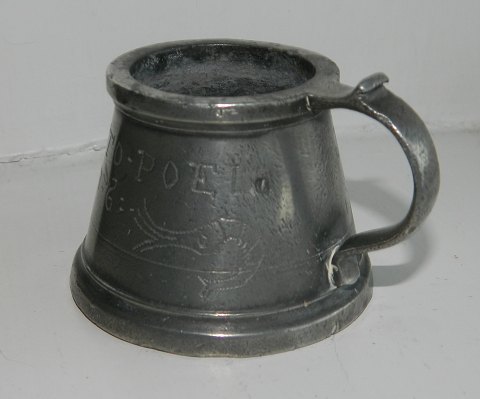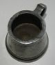 Antik hanekrus eller kop med hank i tin med dekoration af tre rejer ! Text: JOACHIM SVHR TO POEL samt årstal 1776. I god stand uden skader eller reparationer. Fabriksmærket på bunden Mål: 5 cm høj - bundens diameter er 7 cm