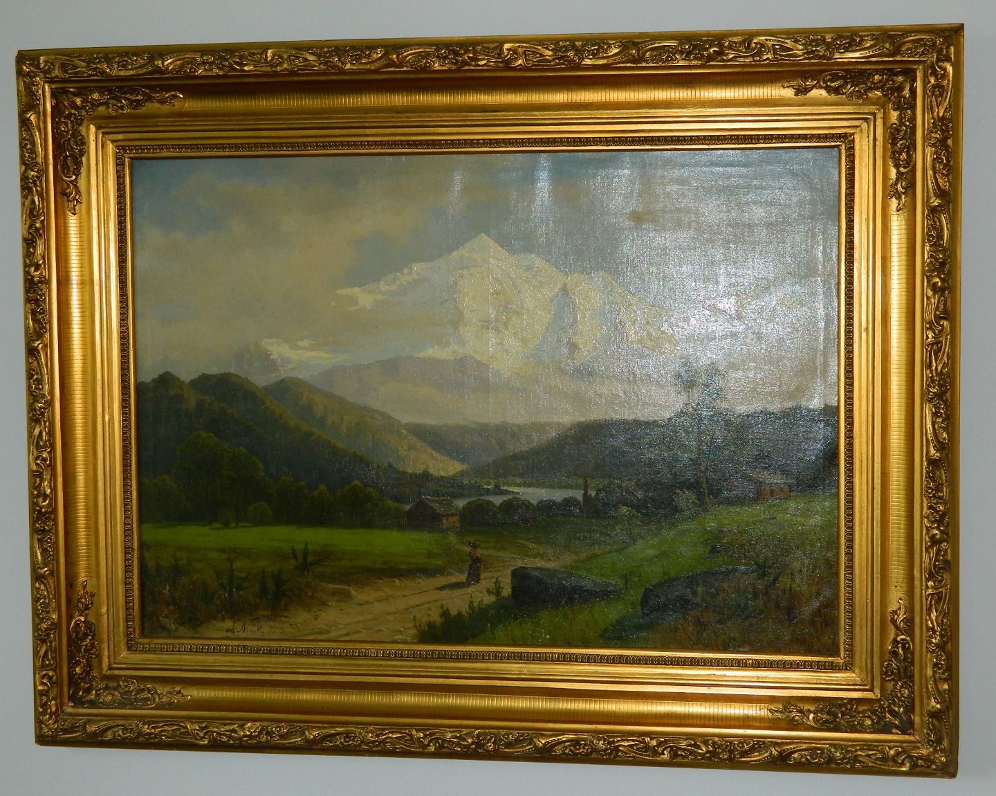 Stort maleri på lærred. Motiv med landskab samt bjerge. Fremstår i god stand. Kraftig guldramme i træ. Ingen signatur. Ingen skader eller reparationer. Mål: 94½ cm x 123 cm