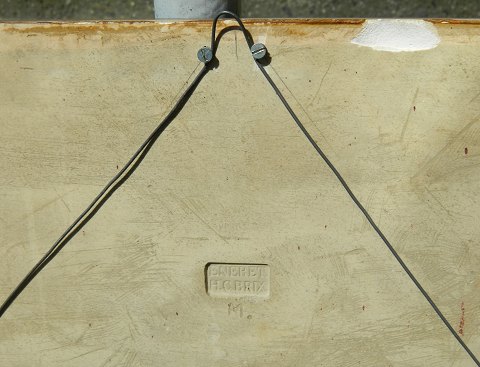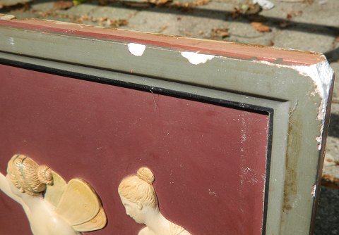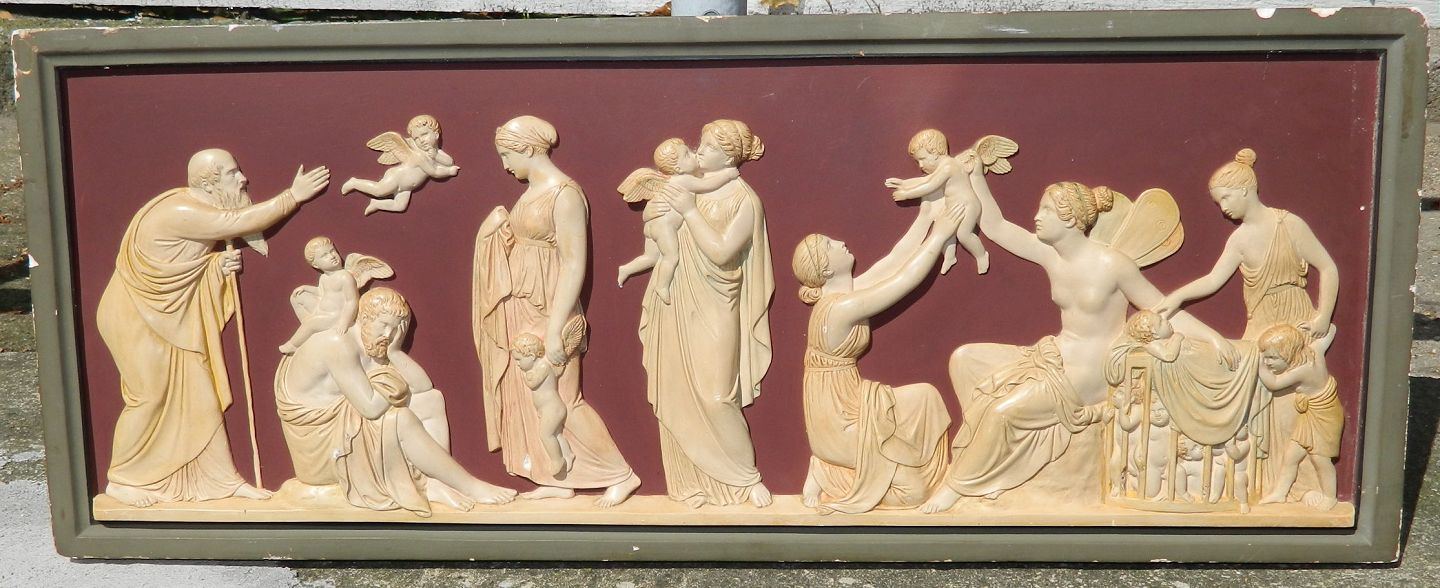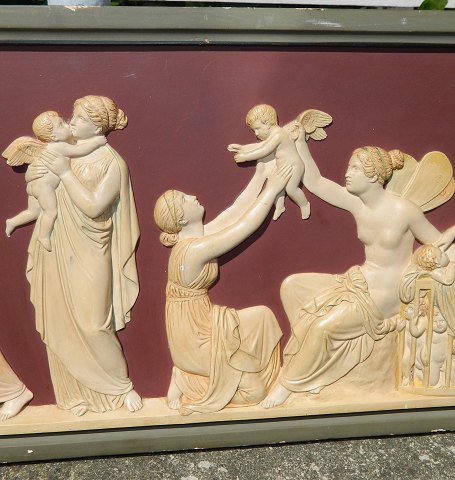 Stort vægrelief i gips fra H. C. Brix værksted ca. 1900 forestillende Bertel Thorvaldsen´s relief med Kærlighedens Aldre. Psyke uddeler amoriner, der symboliserer kærligheden. Her forskellige personers reaktion på gaven - F.eks. den gamle mand der ikke kan nå sin og den unge kvinde, som tilbeder sin amorin (kærlighed). Originalt bemalet bund i bordeaux. Figurerne malet i lyse farver. Relieffet har småhak her og der samt mindre skår. Fabriksstemplet på bagsiden. Mål: 30 cm højt og 76 cm langt. Godt 2 cm dybt.