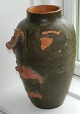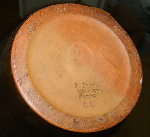 Stor vase i terracotta fra P. Ipsen, Kjøbenhavn, fra ca. 1900. Dekoreret med blomster -og bladværks dekoration i relief (Zantedeschia). Småskår på blomster og blande. Ingen skader på selve vasen. Bemaling af vasen delvist afskallet som fotografierne viser. Fabriksmærket på bunden. Vasen er 28 cm høj.