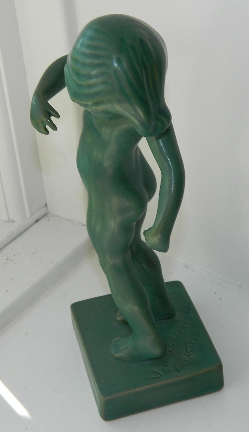 Figur i keramik af Venus Kalipygos fra Peter Ipsens Enke lervarefabrik i København. Dækket af grøn glasur. Udført af billedhuggeren Kai Nielsen. Fremstår i perfekt stand. Ingen skader eller reparationer. Fabriksmærket med PIE på undersiden samt figurens navn samt kunstnersignatur på basens overflade. Figuren er 22 cm