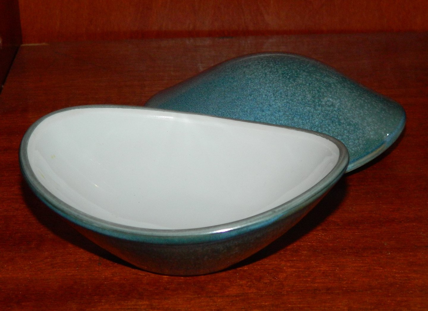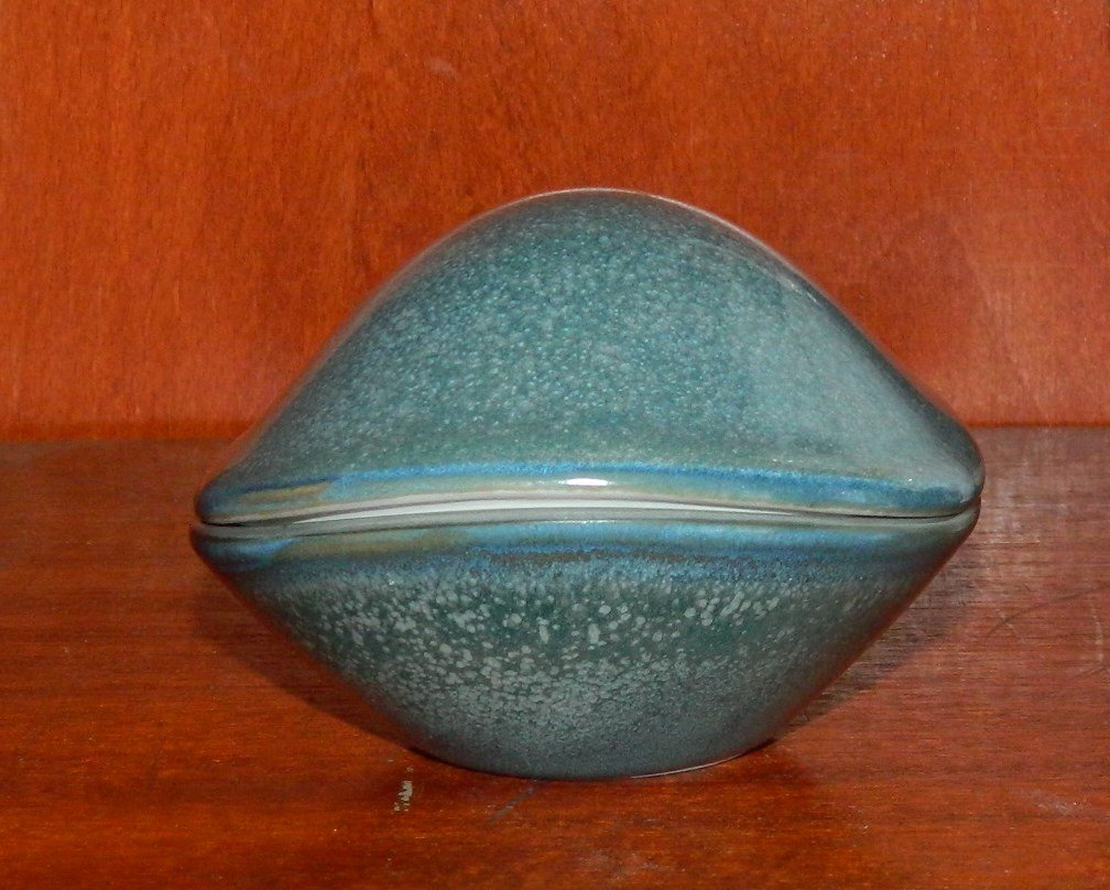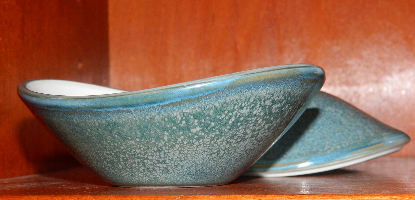 Bobonniere eller lågskål i porcelæn fra Bing & Grøndahl. Modelnummer 747. Designet af Henning Koppel (1918-1981). Ydersiden dekoreret i en blå spættet glasur. Indvendigt hvid. Fremstår i perfekt stand uden skader eller reparationer. Fabriksmærket på bunden hvorunder kunstnerens monogram fremgår. 1. sortering. Mål: H. 7½ cm L. 11 cm B: 9 cm