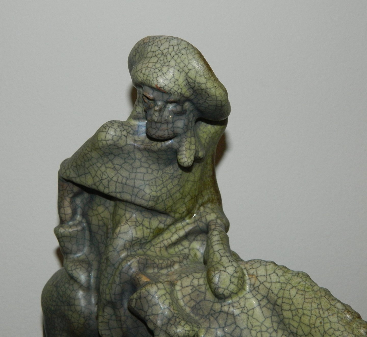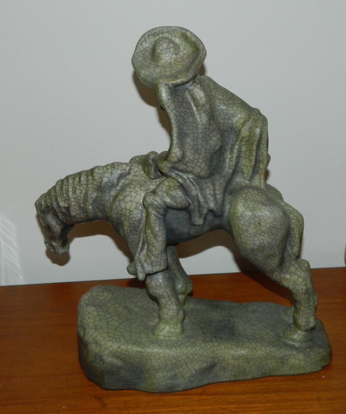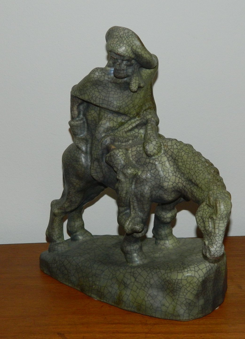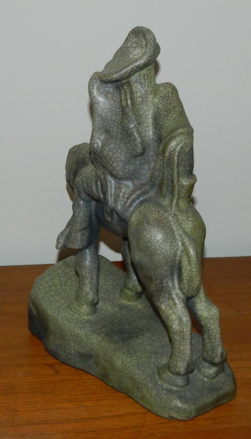 Døden som rytter. Figur i keramik fra Michael Andersen & Søn. Dækket af krakkeleret glasur. Fremstår i perfekt stand uden skader eller reparationer. MA&S fabrikslogo, Rønne´s Byvåben, i relief på undersiden sammen med modelnummer: 3226. Mål: H. 34 cm. L. 32½ cm.