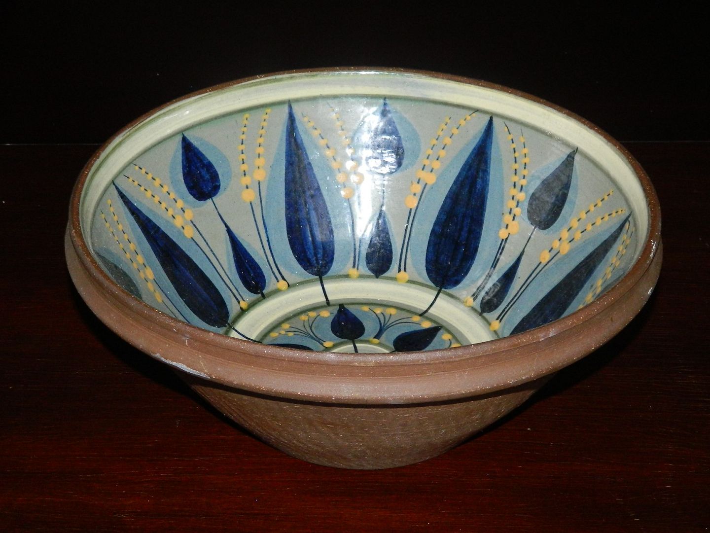Skål i keramik fra Dybdahl keramik Danmark. Kun dekoreret og glaseret indvendigt. Produceret i 1973. Anordning til ophængning på væggen på bagsiden. Fremstår i perfekt stand. Fabriksmærket på bunden. Mål: H. 14 cm Ø. 33 cm.
