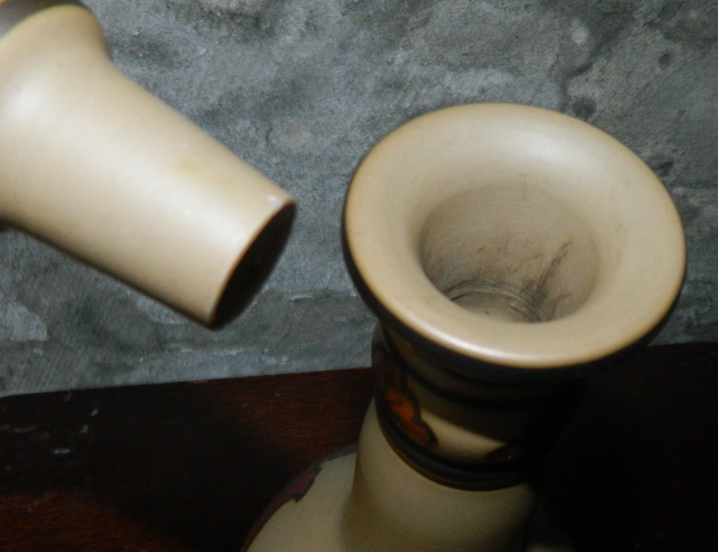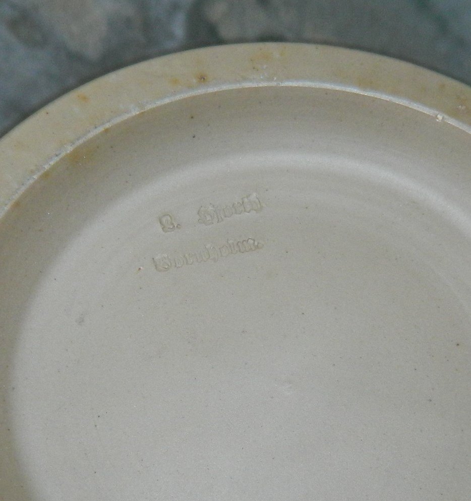 Sjælden karaffel med tilhørende propi keramik fra Lauritz Hjorth, Rønne, Bornholm fra begyndelsen af 20. århundrede. Bemalet dekoration i skønvirkestil. Fremstår i perfekt stand. Ingen skader eller reparationer. Fabriksmærket på bunden. Mål: 33 cm.