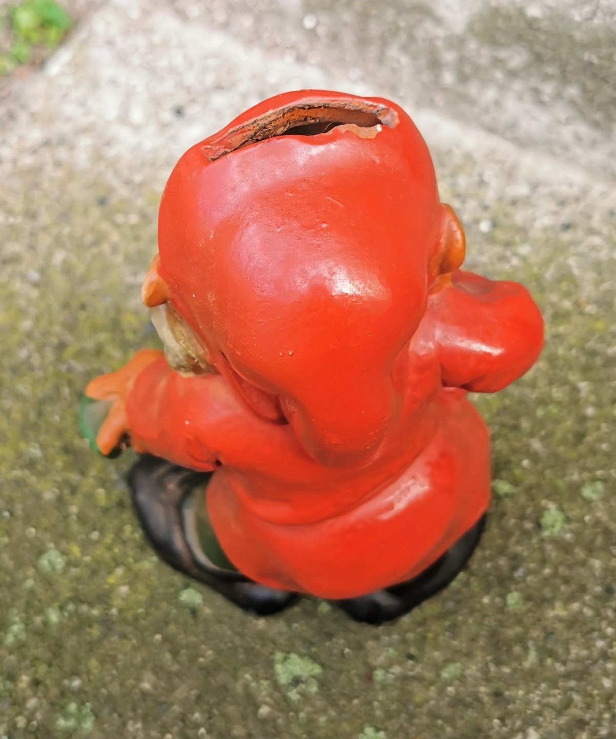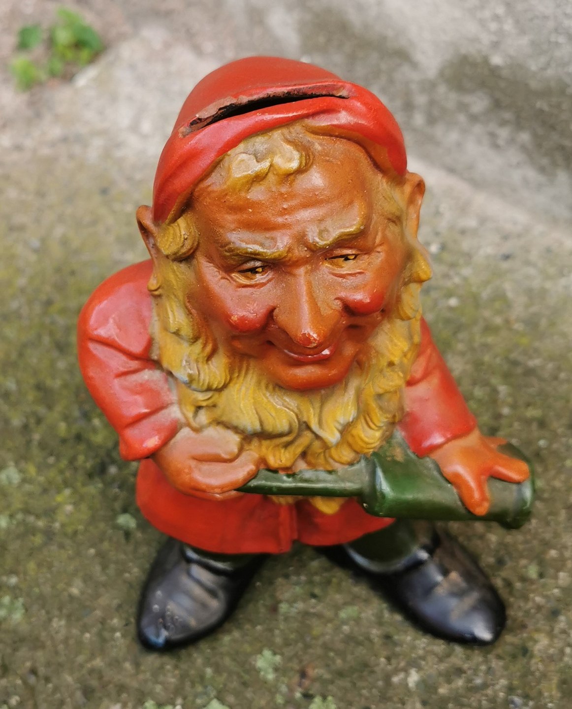 Bemalet nisse i keramik med bollesprøjte med funktion som sparebøsse. Fremstillet omkring 1900. Lidt småskår ved "møntrevnen". Ellers intet at bemærke. H. 16 cm.