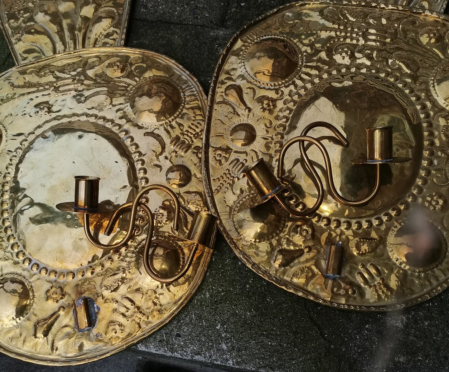 Par Lysskjold fra midten af 19. århundrede. Udført i messing med to-armede lysholdere (nyere tilvirkede). Fremstår med almindeligt brugsspor. Det ene topspejl trænger til lodning/fastgørelse. Mål: H. 51 cm B: 30