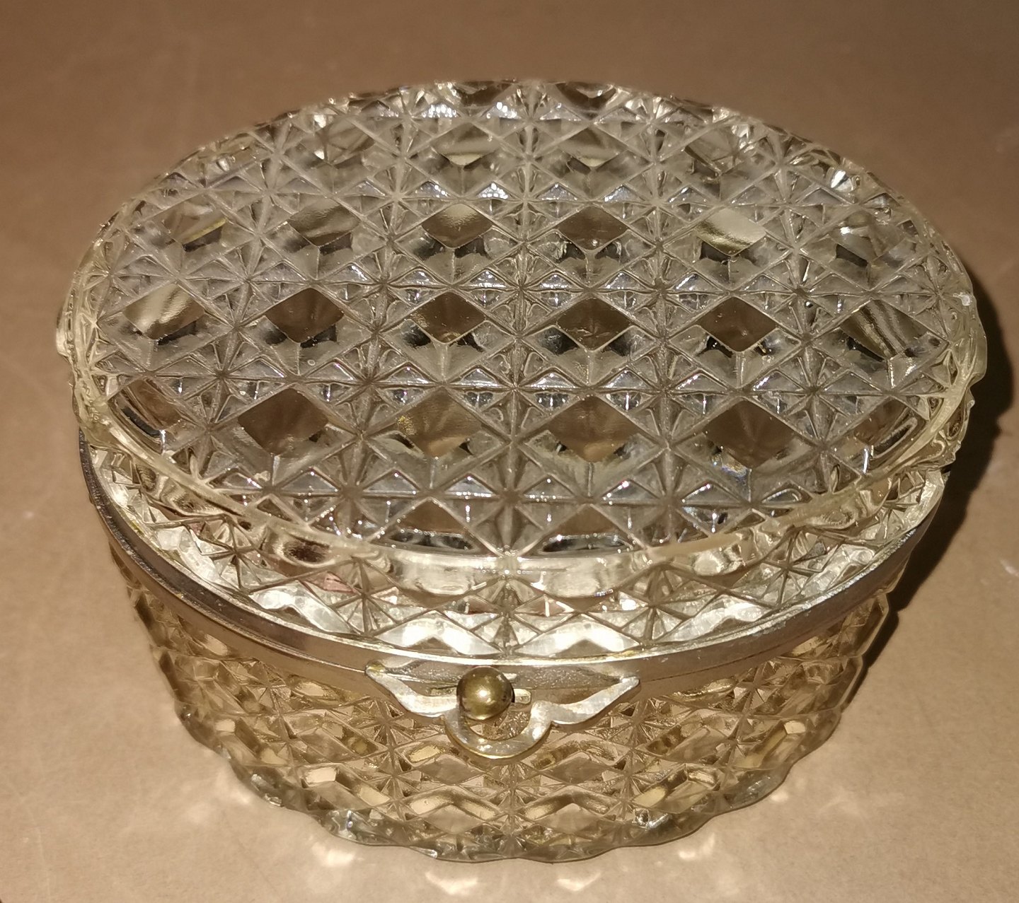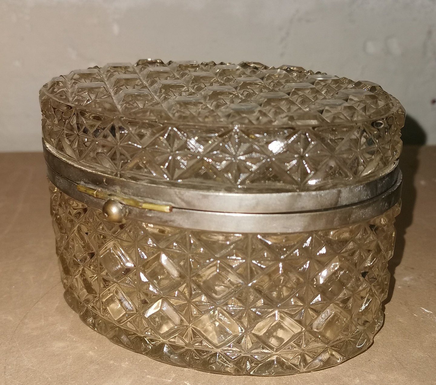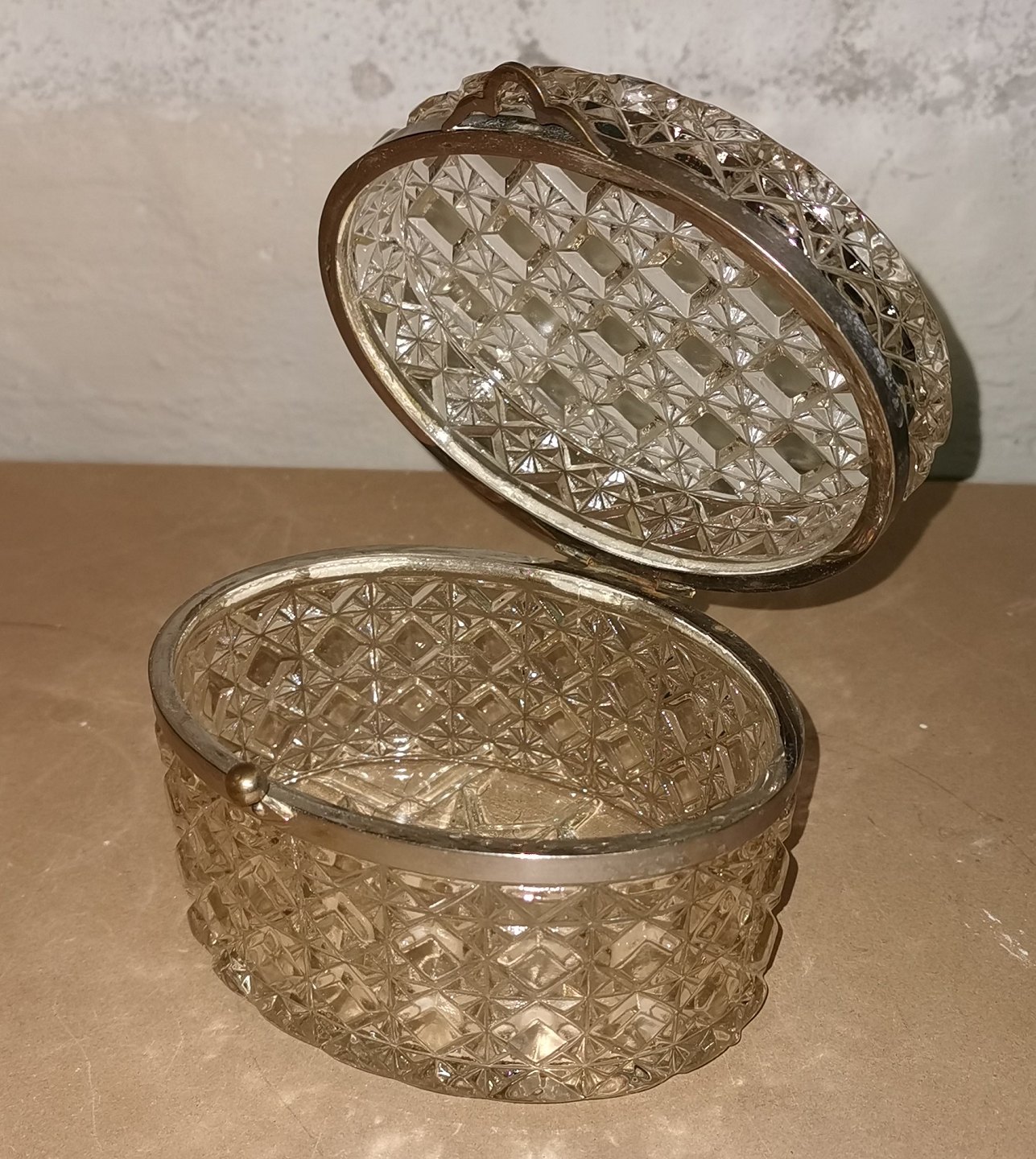 Sukkerskrin i glas: Ovalt sukkerskrin i krystalglas med metalmontering. Produceret omkring 1900. Ingen skader eller reparationer. Mål: H. 9½ cm B. 13 cm L. 15 cm.