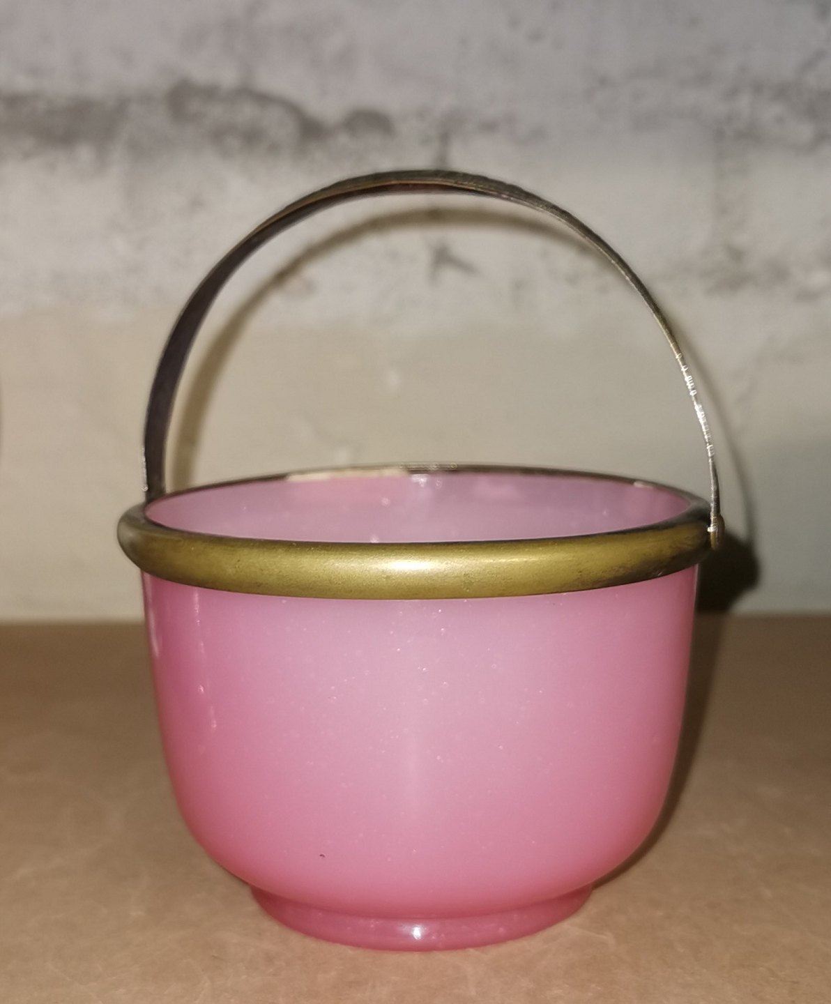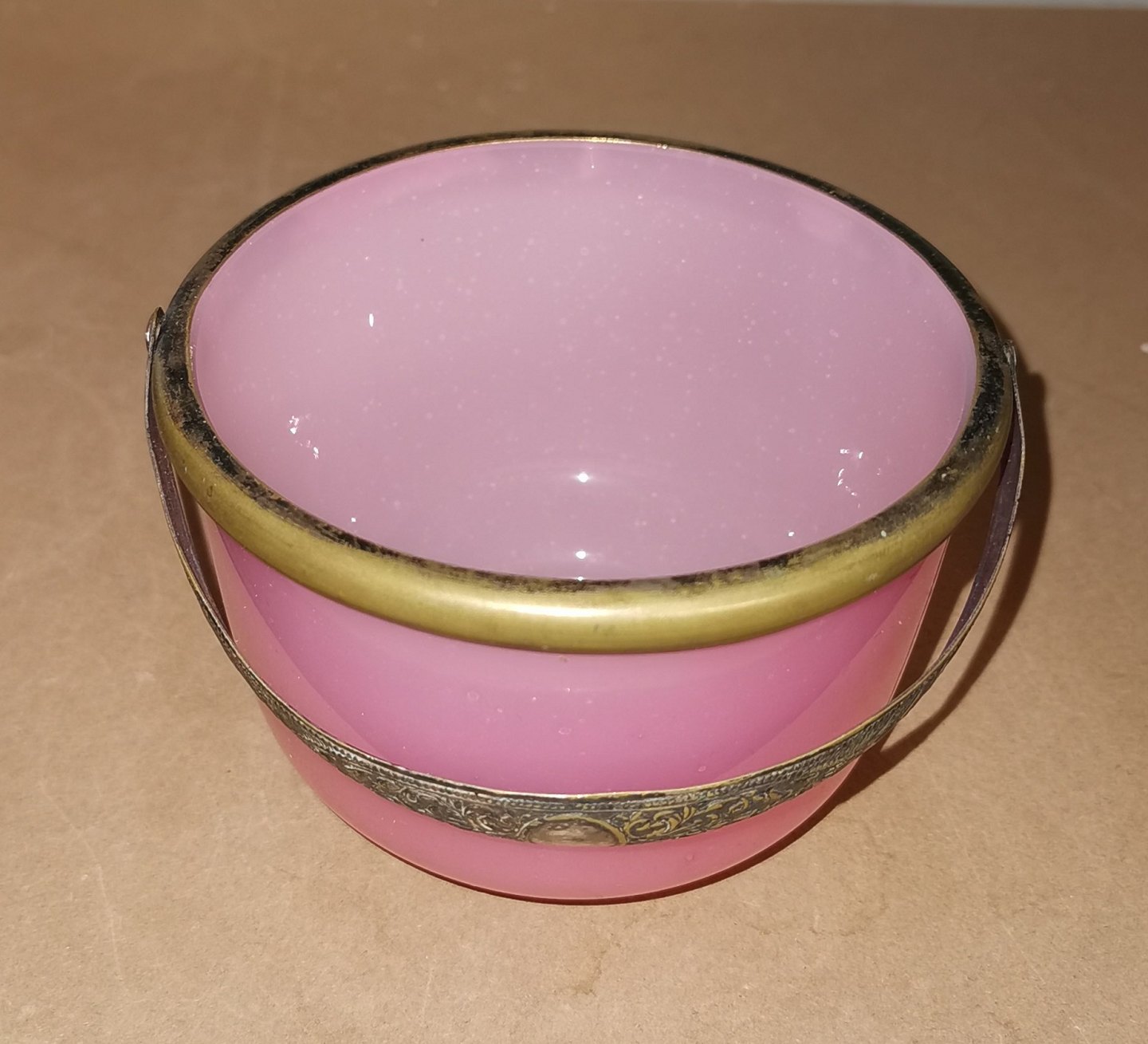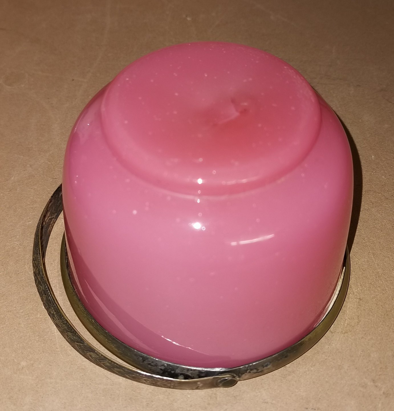 Gammelt glas fra slutningen af 19. århundrede: Sukkerskål i lyserødt opalineglas med monteret hank i sølvplet. Ingen skader eller reparationer. Mål: H. 8 cm Ø. 11½ cm.