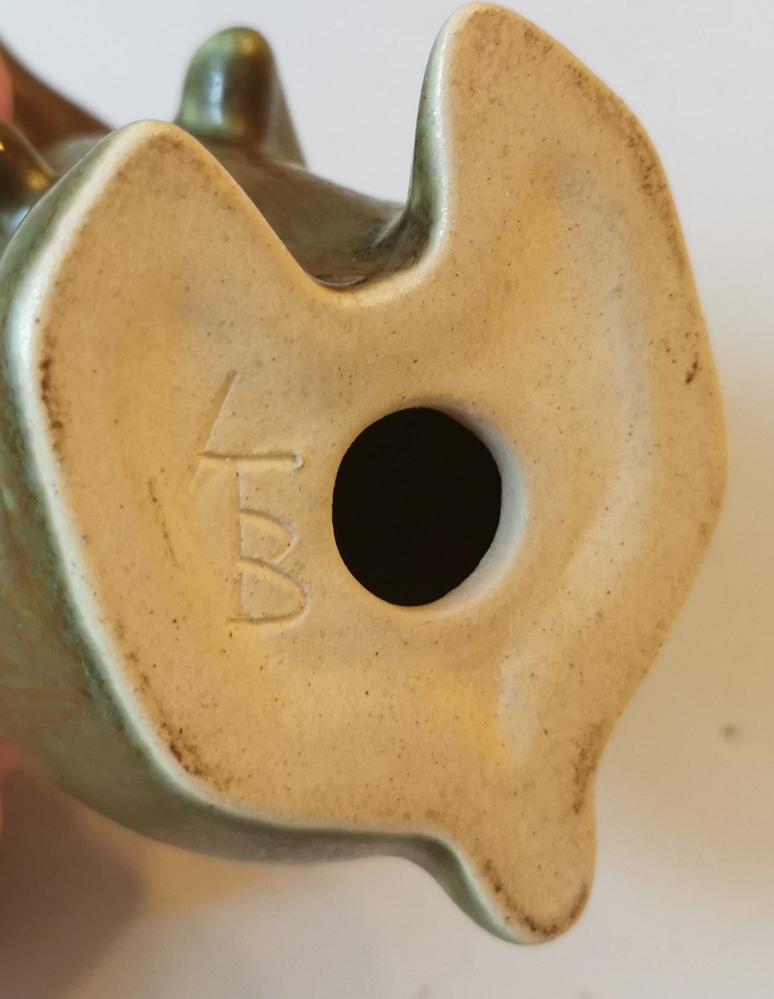 STOR FIGUR i keramik af kanin unge af Knud Basse, Vang, Bornholm. Dækket af en brug harepelsglasur. Fremstår i god stand uden skader eller reparationer. H. 16½ cm. Kunstnersignatur KB på undersiden.