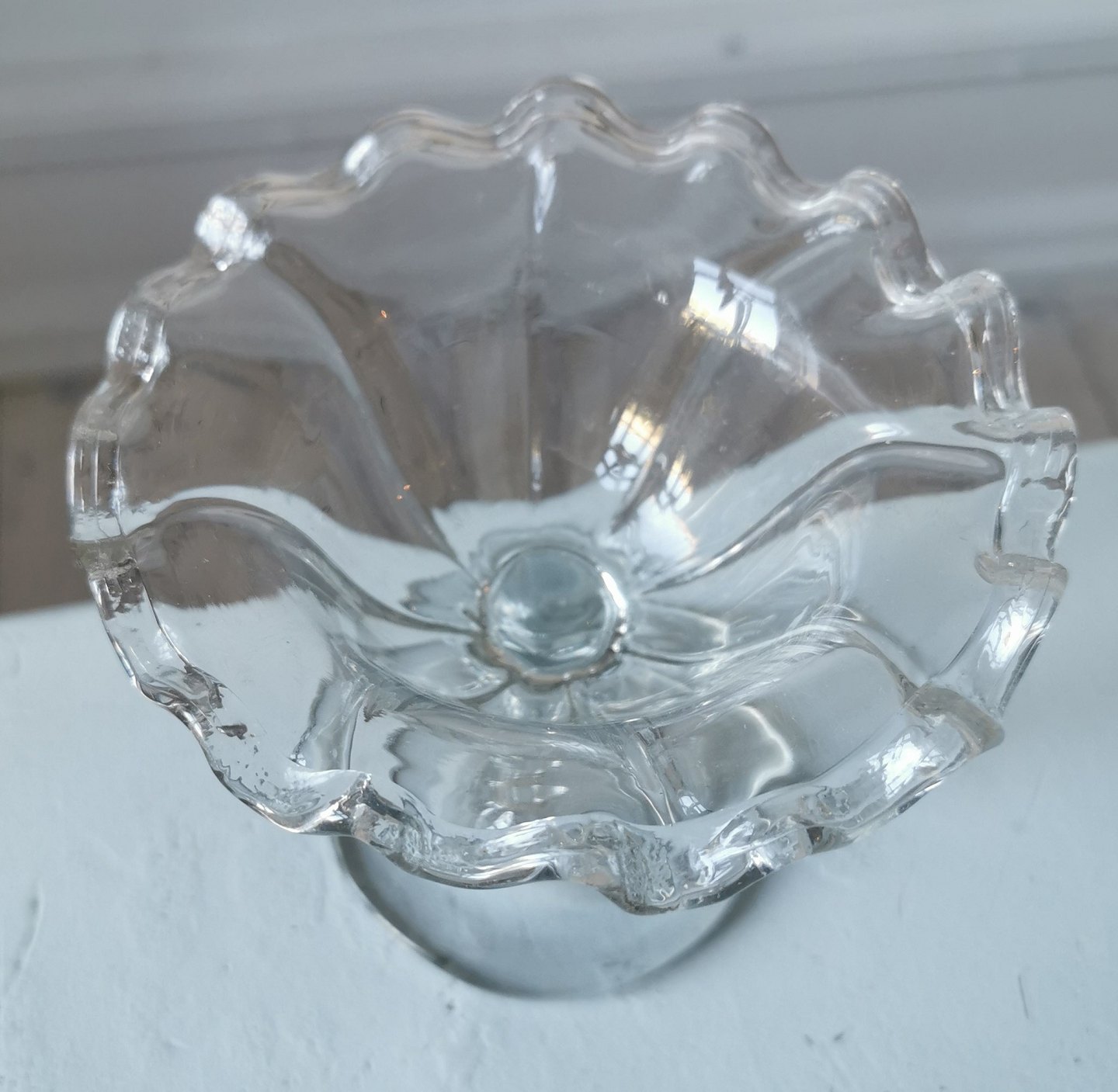 Kandisskål / sukkerskål i klart glas. Bølget og ombukket kant på kummen. Fremstår i perfekt stand. Ingen reparationer. H. 11 cm
