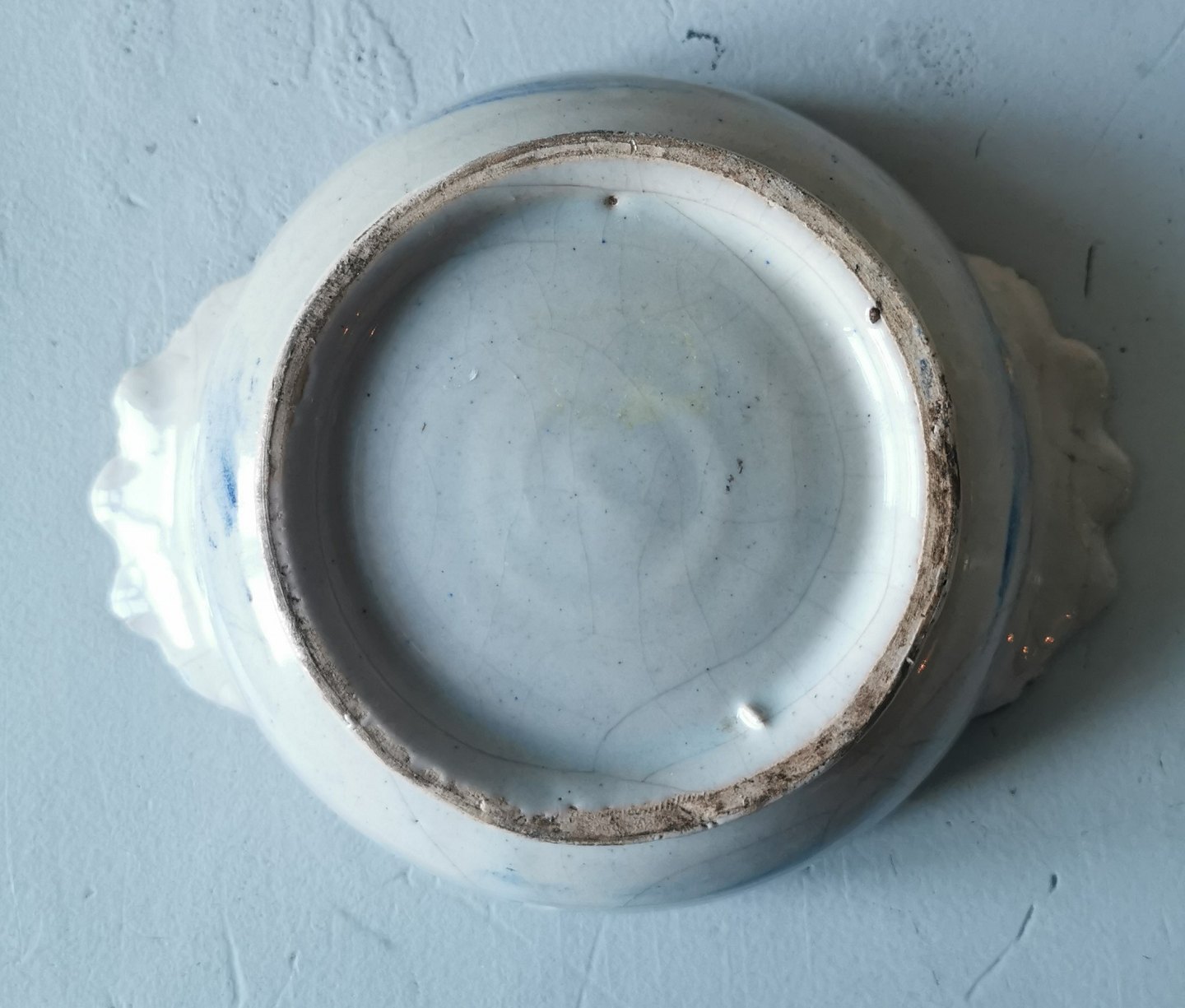 Charmerende øreskål i fajance med dekoration af sejlskib i bunden af skålen. Almindeligt brugsspor på kanten. Ingen skader eller reparationer. Formodes fremstillet Mellemeuropa. H. 5 cm Fra øre til øre: 15 cm.