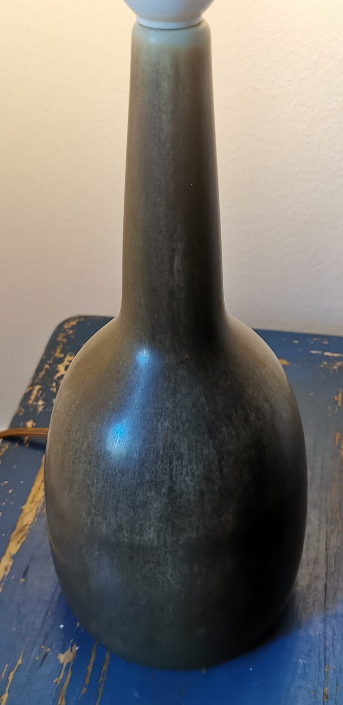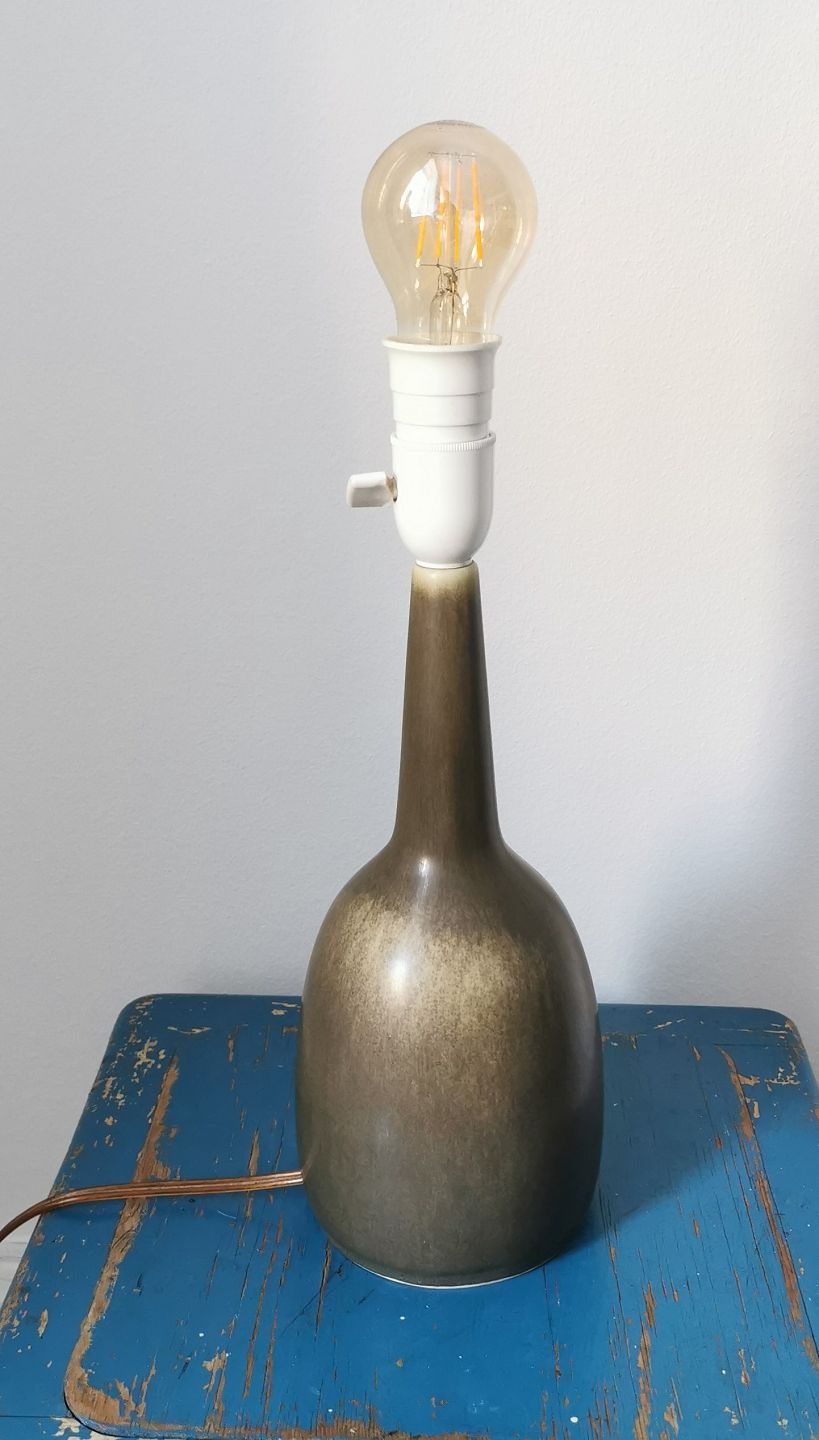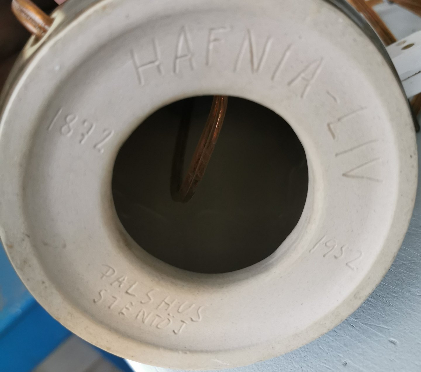 Lampe i keramik fra Palshus. Dækket af brun harepelsglasur. Fremstillet i 1952. Indgraveret i anledning af Forsikringsselskabet Hafnia´s jubilæum i 1952. Fremstår i perfekt stand. Højde hhv. 27/35½ cm (uden pærer).