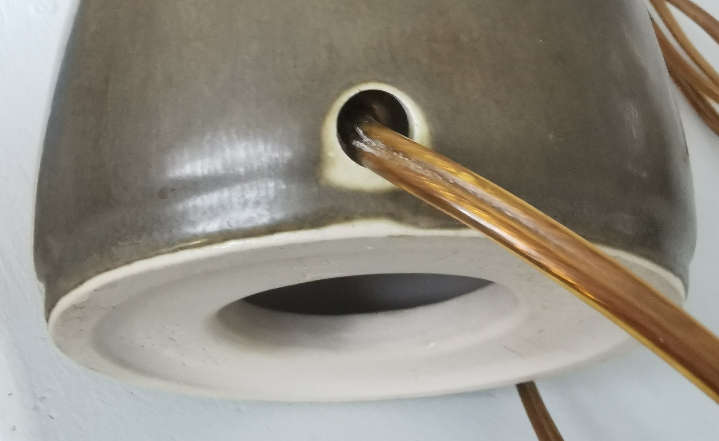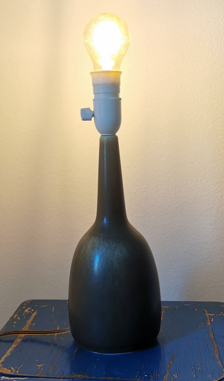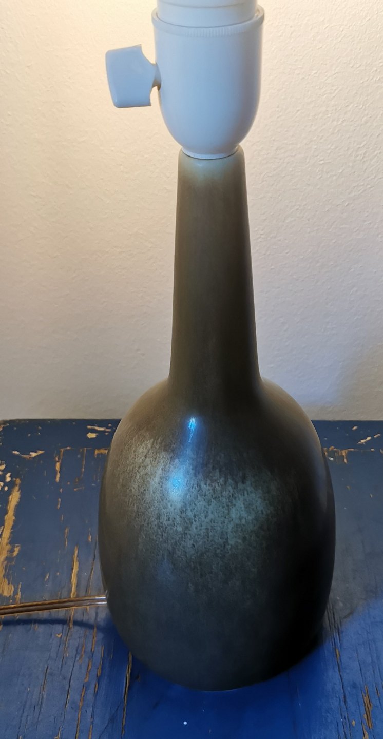 Lampe i keramik fra Palshus. Dækket af brun harepelsglasur. Fremstillet i 1952. Indgraveret i anledning af Forsikringsselskabet Hafnia´s jubilæum i 1952. Fremstår i perfekt stand. Højde hhv. 27/35½ cm (uden pærer).