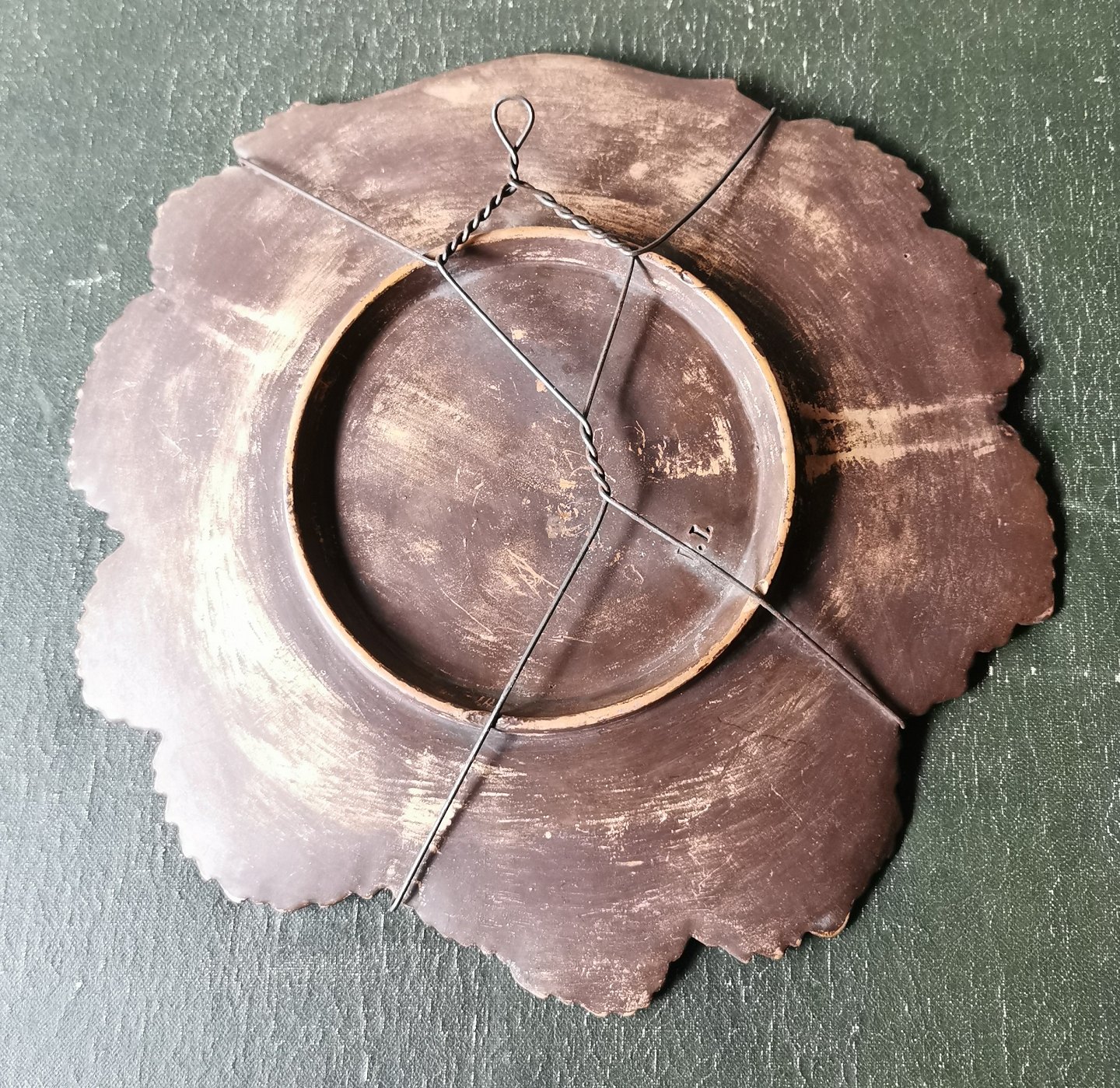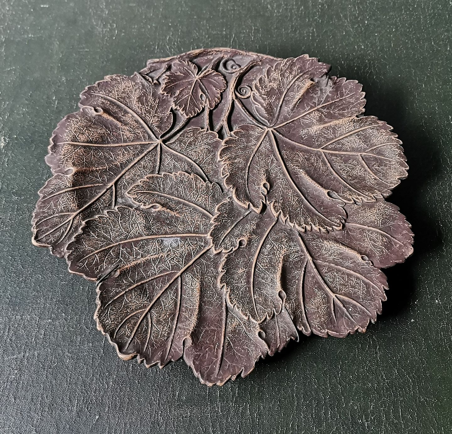 Bladformet fad i keramik / teracotta fra den københavnske teracottafabrik Peter Ipsen. Fremstillet i begyndelsen af produktionsperioden ca. 1850. Lidt brugsspor. Ingen skader eller reparationer. Fabriksmærket med P.I på bagsiden. Mål: H. 23 cm B. 25 cm.