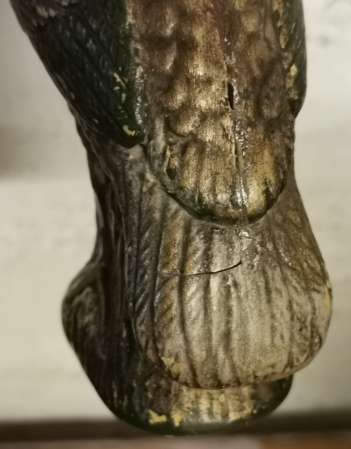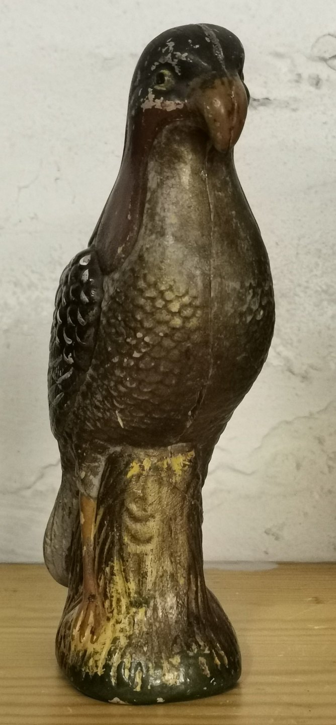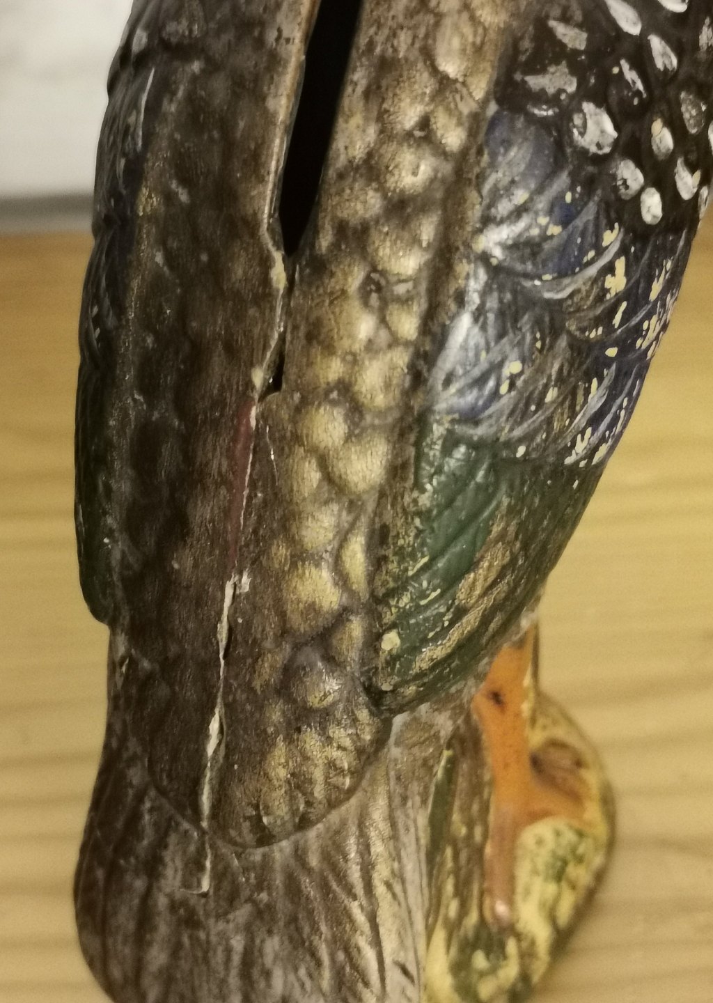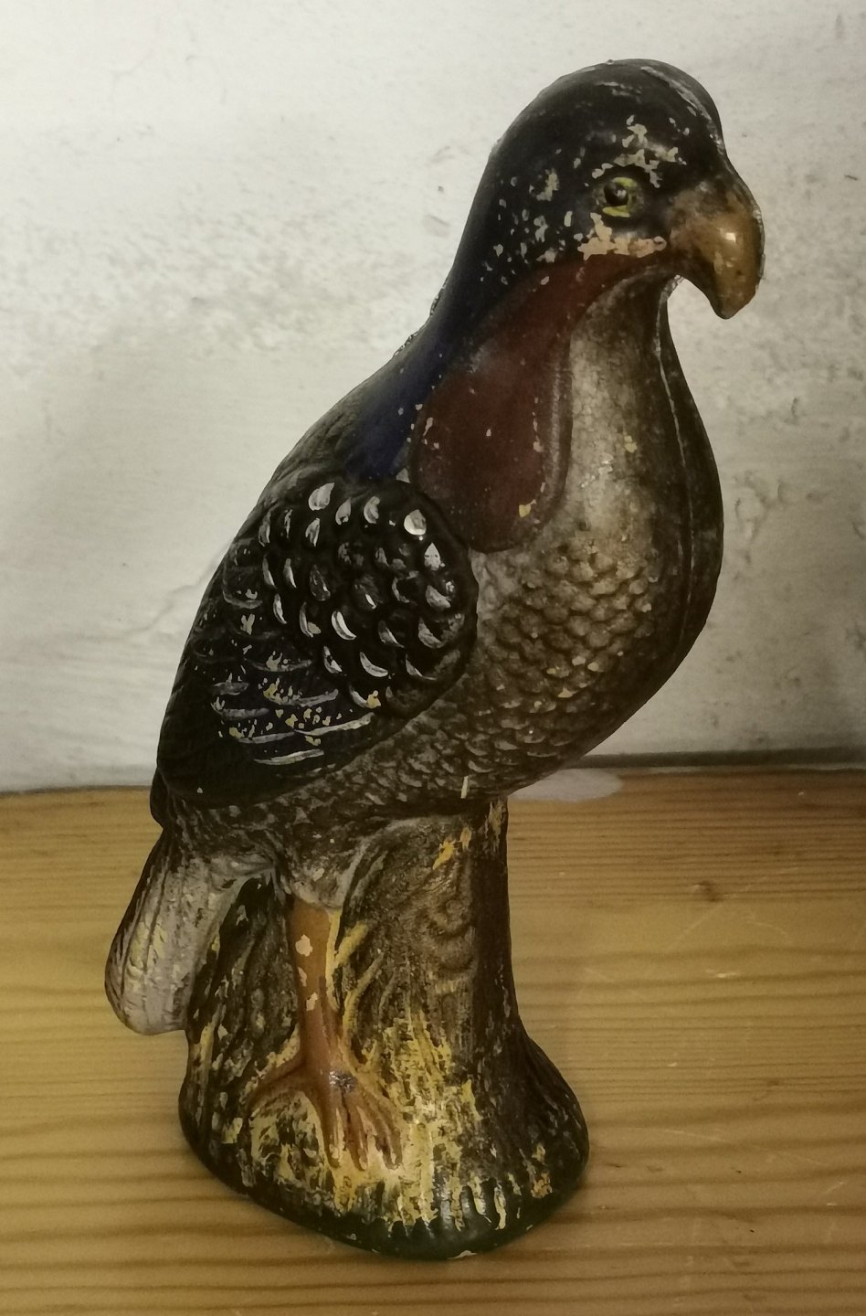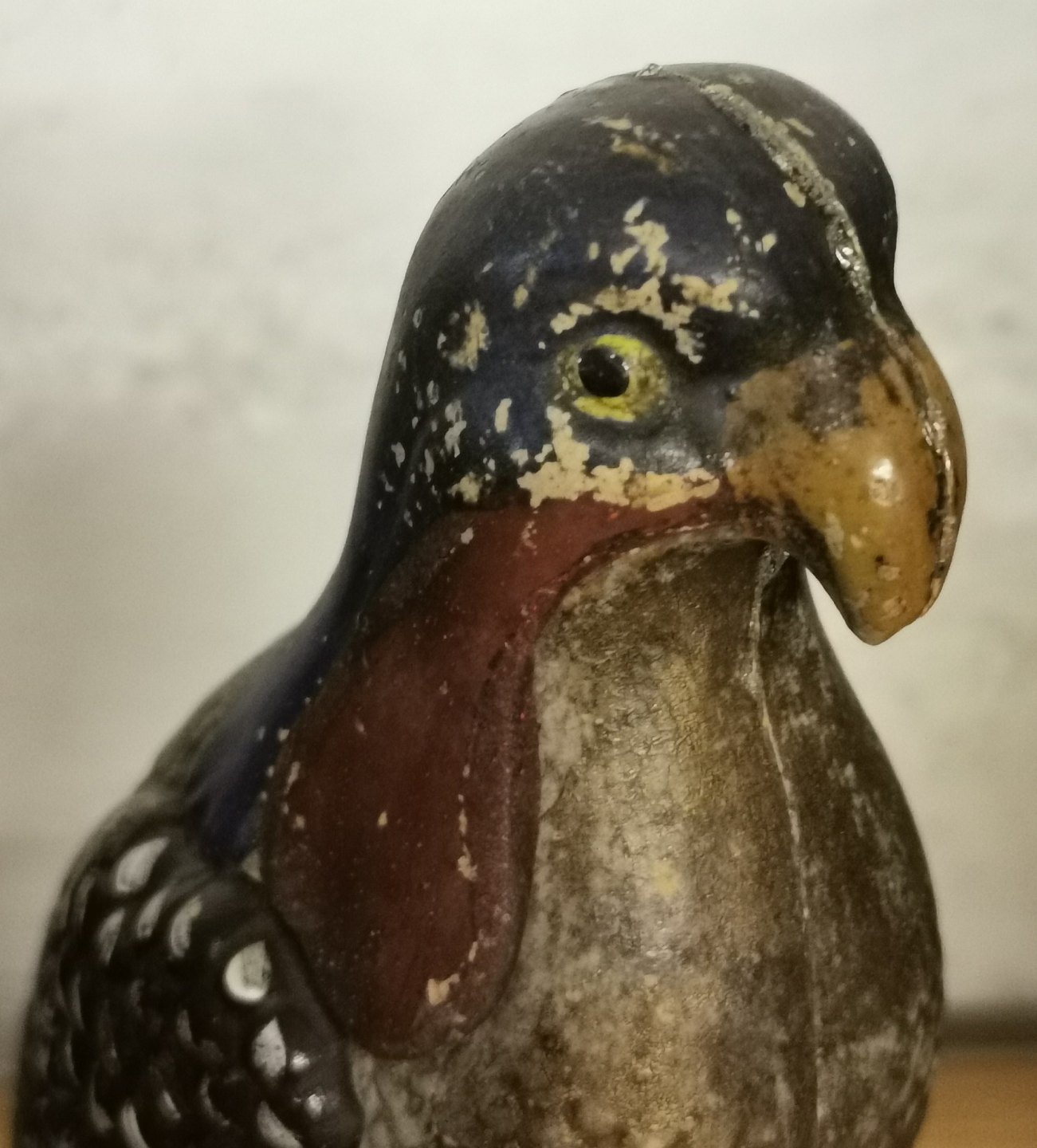 Figur af papegøje som sparegris / sparebøsse i bemalet keramik. Fremstillet i anden halvdel af 19. århundrede. Defekt som det fremgår af billederne. H. 17 cm