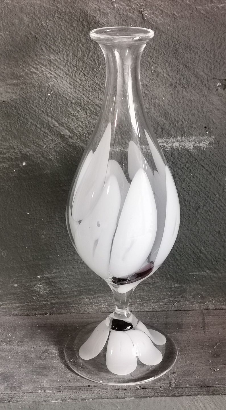 Holmegaard karaffel på fod i glas fra "Vintergæk" serien. Fremstår i god stand uden skader eller reparationer. Ikke signeret ! Mål: H. 29 cm. Fodens diameter er 10½ cm.