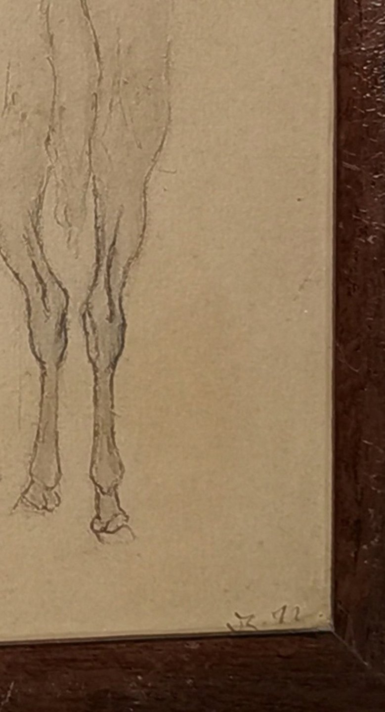 Blyantstegning af hest fra 1872 i træramme i mahogni. Tegnet af Valdemar Irminger (1850-1938). Signeret af kunstneren i nederste højre hjørne. Betegnet på bagsiden. I god stand. Mål: 24½ x 27½ cm.