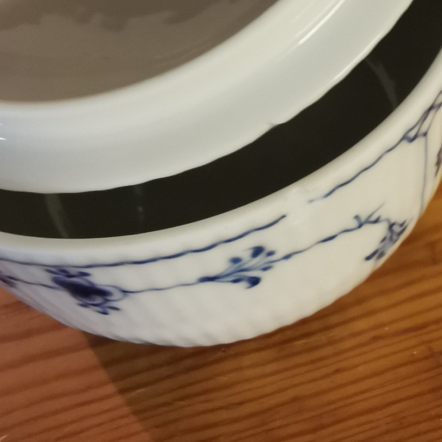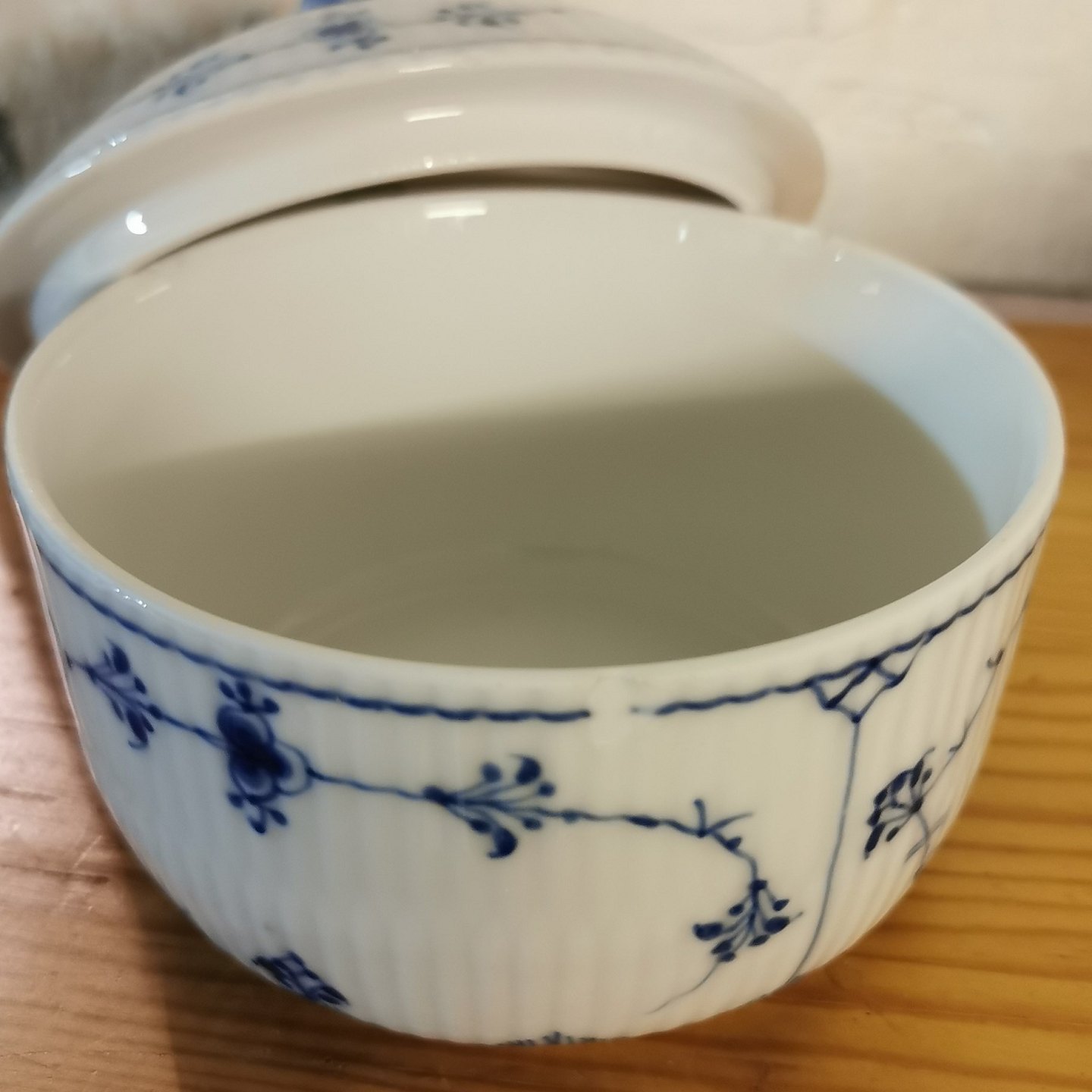 Skål med låg i musselmalet riflet porcelæn fra Royal Copenhagen. Låget har ét skår. Skålen har to skår. Det ene ses tydeligt på fotos det andet (der sidder et sted på kanten) er meget lille ! Låg og skål hører sammen med modelnummer 1-242. De er to produceret på forskellige tidspunkter, hvorfor de ikke er "født sammen". H. 9½ cm incl. låg.