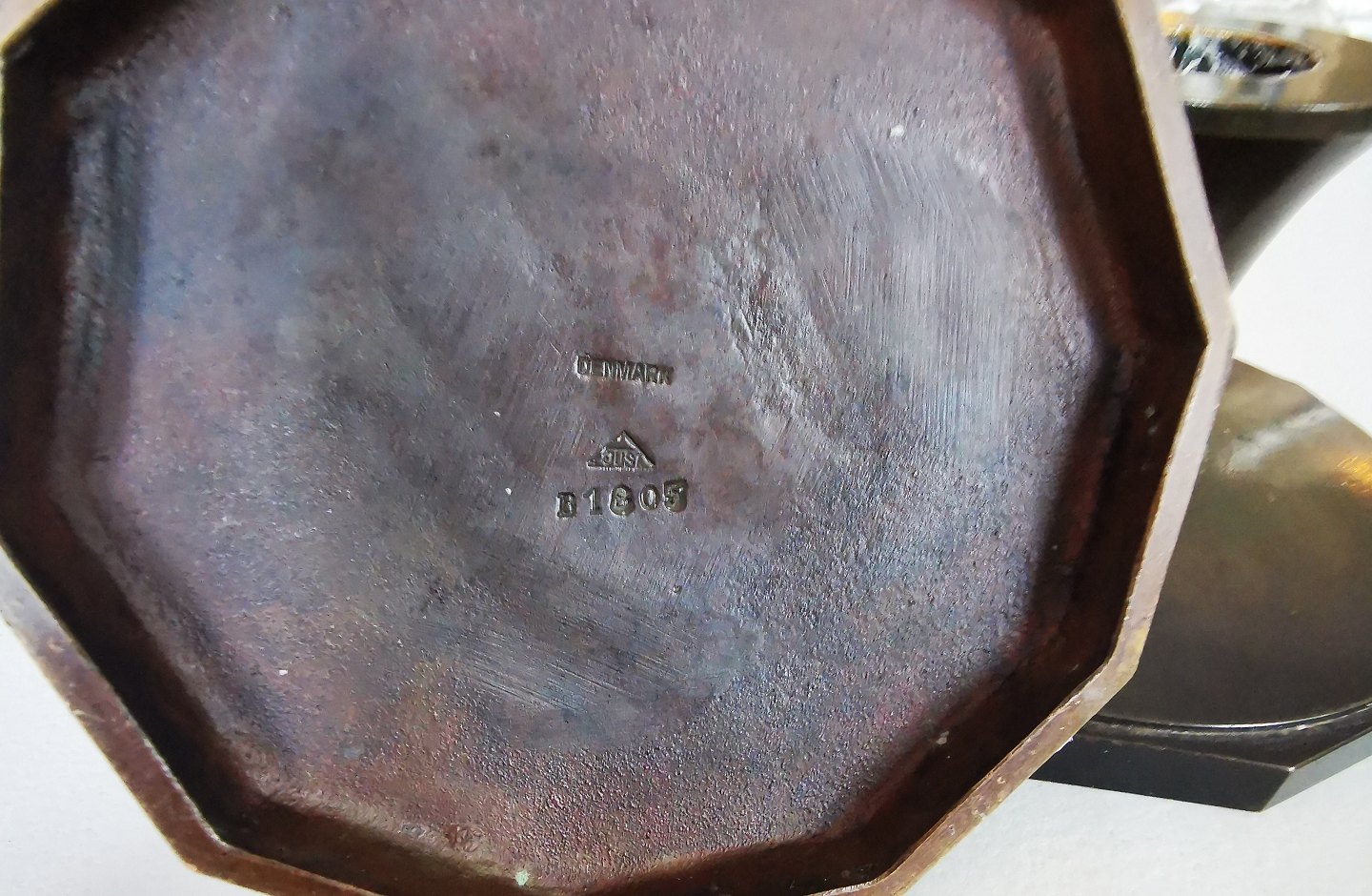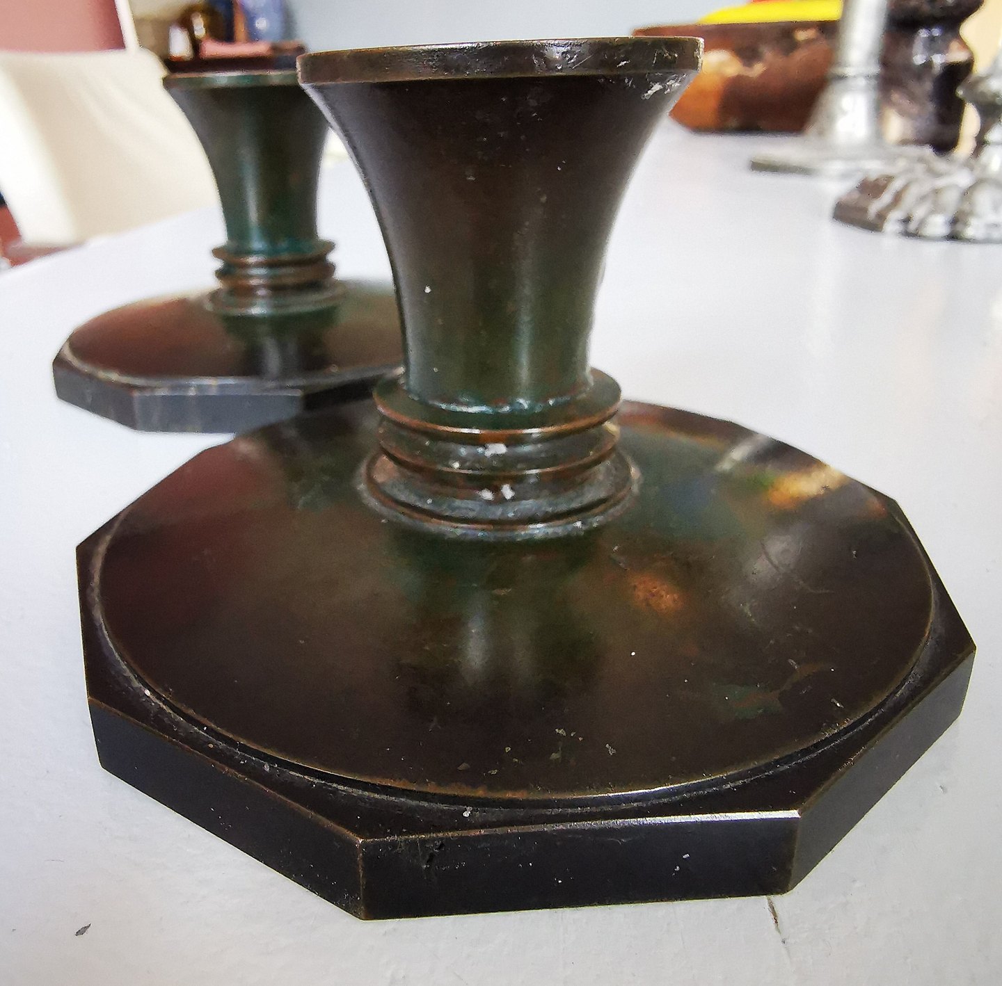 Par lysestager i bronze i Art Deco stil fra Just Andersen. Fremstår i god stand uden skader eller reparationer. H. 7 cm. Bundens "diameter" er er 10½ cm. Stemplet B1805 DENMARK samt fabrikslogo.