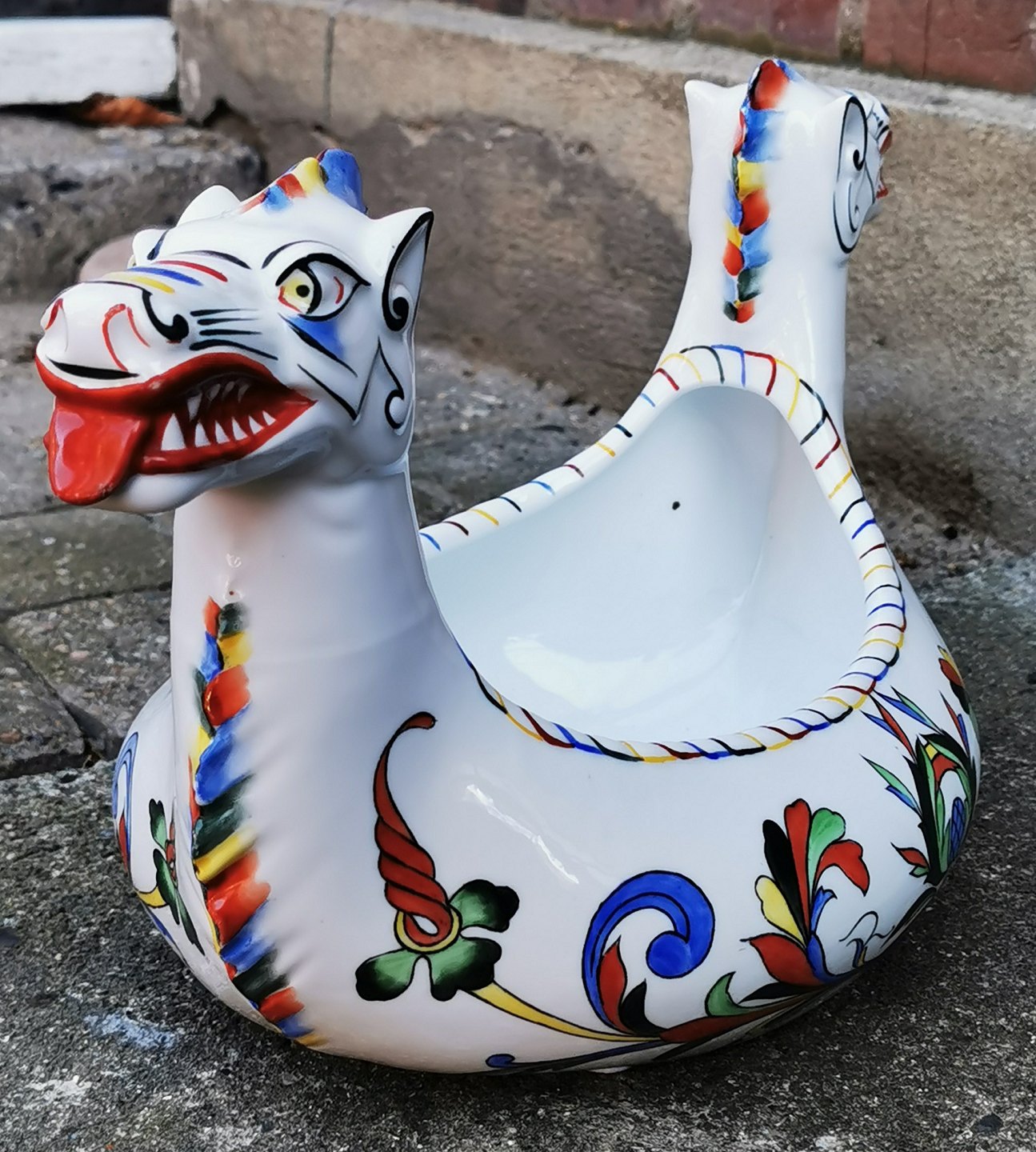 Såkaldt kjænge (kjenge) i porcelæn fra den norske porcelænsfabrik Porsgrund. I perfekt stand. Ingen skader eller reparationer. Fabriksmærket på bunden. Mål: H. 22 cm Brede 21 cm samt 38 cm lang.
